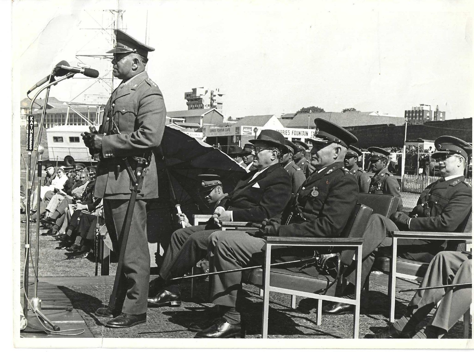 Captain S Pillai addressing the families, relatives and friends during a Passing Out Parade at Curries Fountain Grounds the 1970’s. Minister of Police, The Honourable TJ Kruger seated in the background with Brigadier HG “Hennie” de Witt (later Commissioner) next to him
