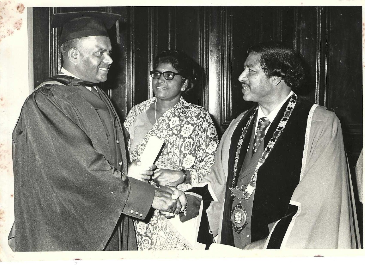 After his graduation Captain Pillai is seen with his dear wife Vimla, being congratulated by the Mayor of Isipingo, His Worship Mr Falcon Khan, circa 1975