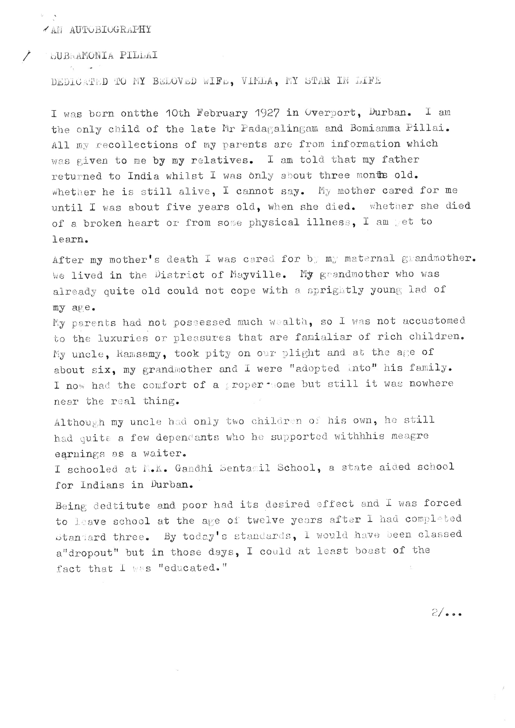 I was born on the 10th February 1927 in Overport, Durban. I am the only child of late Mr Padagalingam and Bomiamma Pillai.