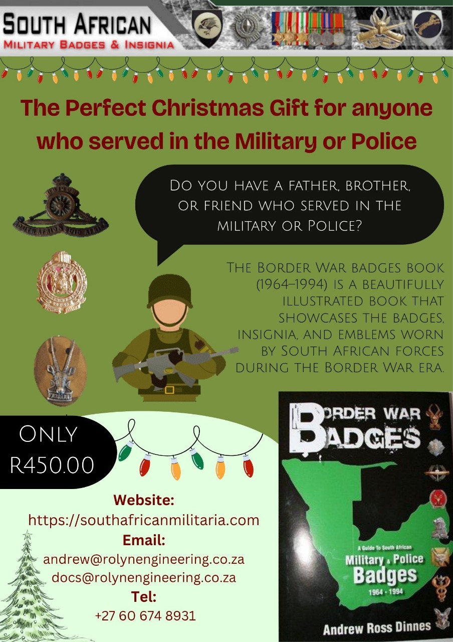 “Border War Badges is a full colour hard cover book. It illustrates the badges and insignia of the SADF, SWATF, SAP and Homelands from 1964 to 1994. It’s not a coffee table book, but a bar counter book”.