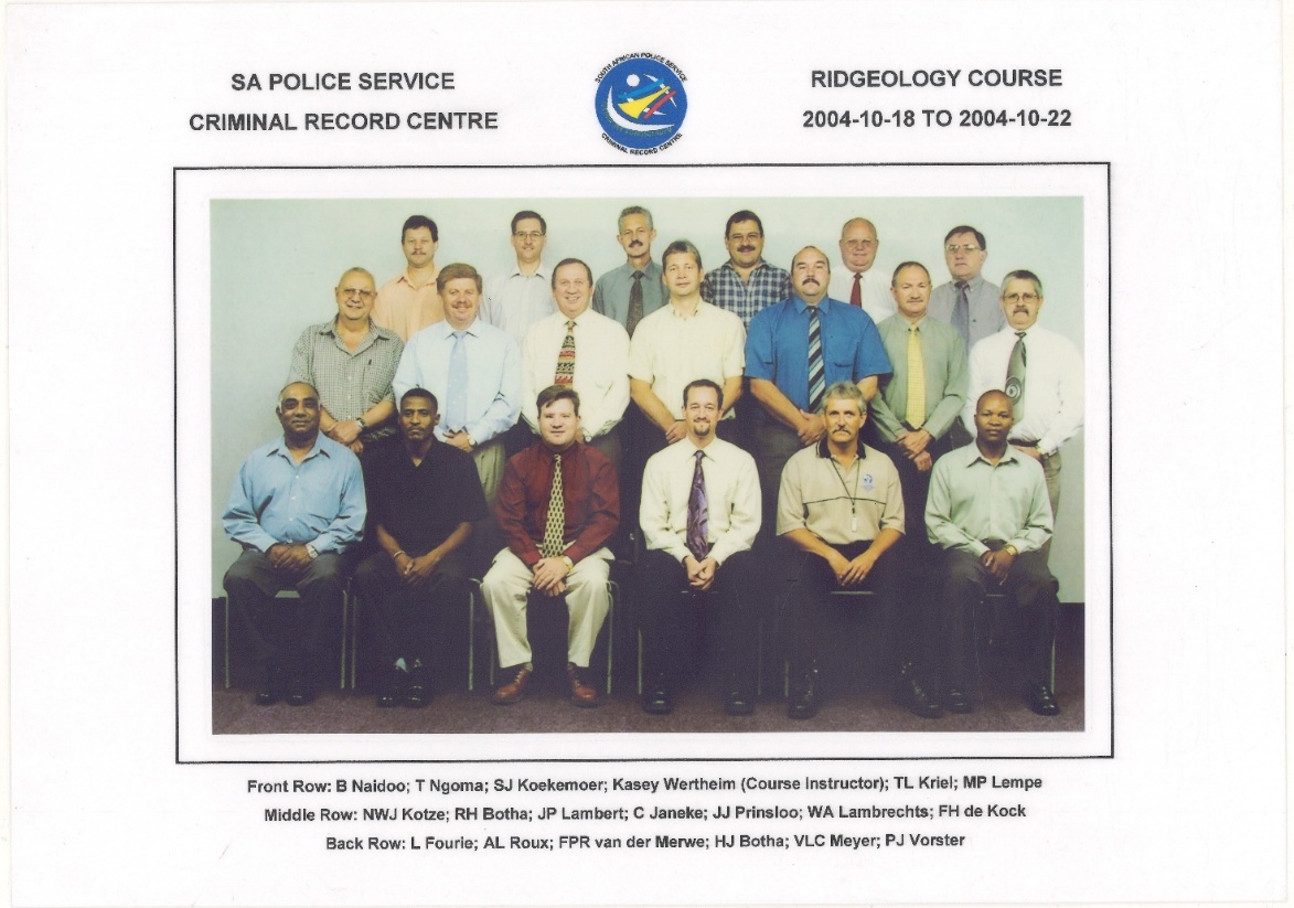 The South African Police Service later selected him to attend two international conferences on the scientific investigation of crime, one in Durham, United Kingdom, and another in Brussels, Belgium, representing South Africa on the global forensic stage.”