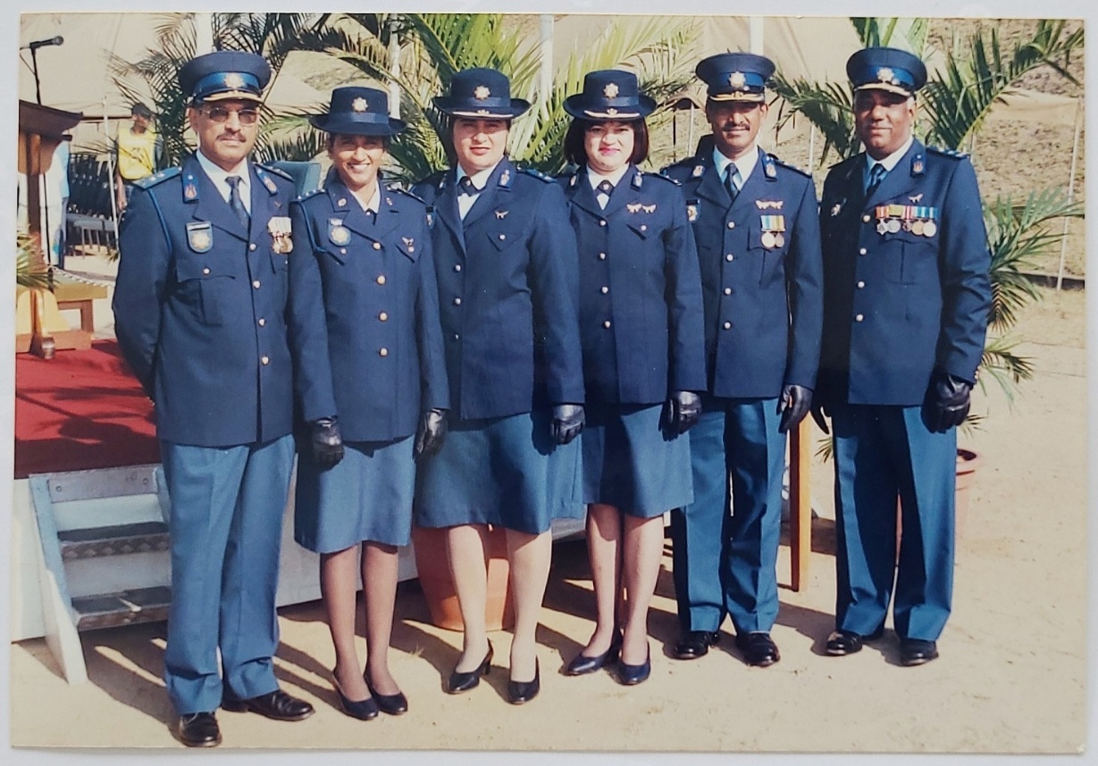 L-R, Major General Ramsaroop; Colonels Shireen Ramchunder; Miranda Hurinarain; Niri Nayager; Major General Bala Naidoo and Brigadier Bala Naidoo (Information provided by Colonel Niri Nayager. – [LG])