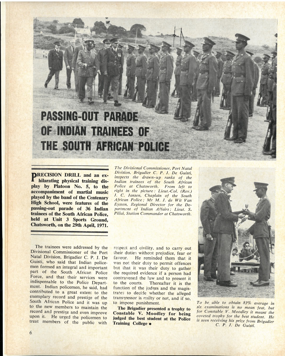 mean feat, but for Constable V Moodley (B Naidoo NOT V Moodley – [LG]) it meant the coveted trophy for the best student. He is seeing receiving his prize from Brigadier CPJ De Guisti.”