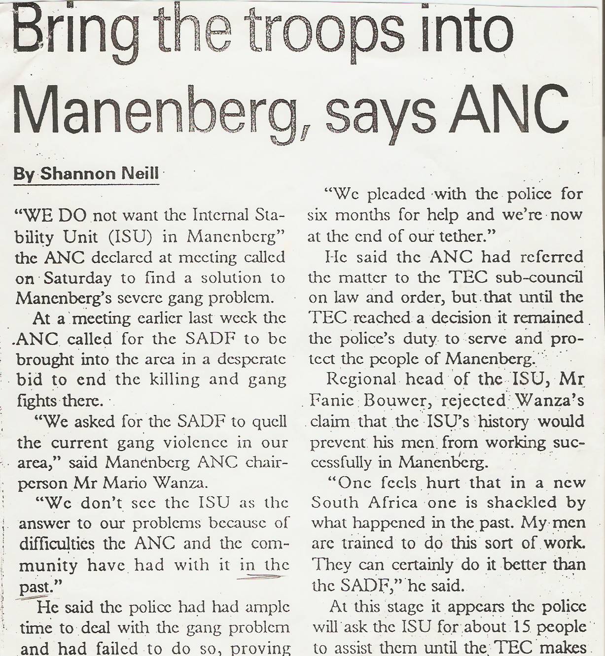 Die ANC wou ons kamma nie in Manenberg hê nie. My Afdeling – die ISU (“Internal Stability Unit”) sou blykbaar die oorsaak van die probleme wees.