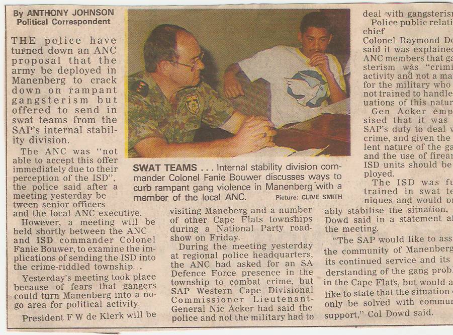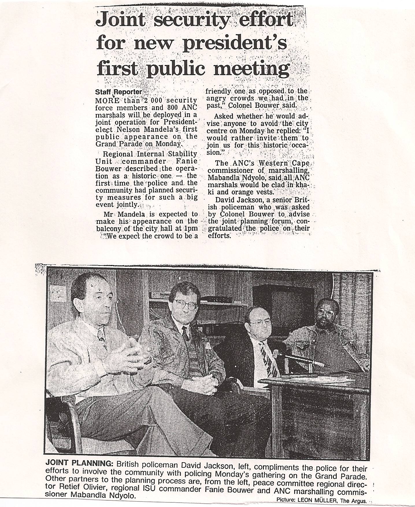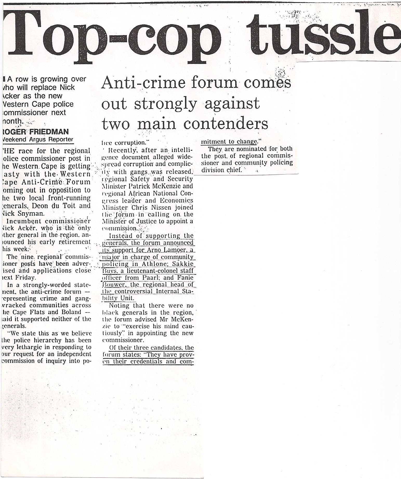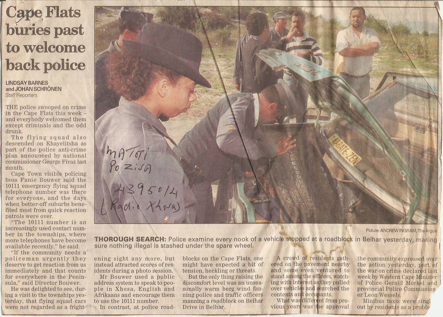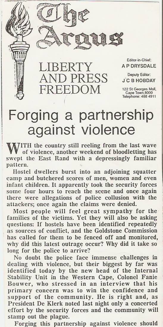 Die Redakteur van die Cape Argus koerant verwys hierbo na my stelling oor die samewerking van die gemeenskap in die voorkoming van geweld in daardie moeilike dae – 1993. Lees laaste 2 paragrawe hierbo.