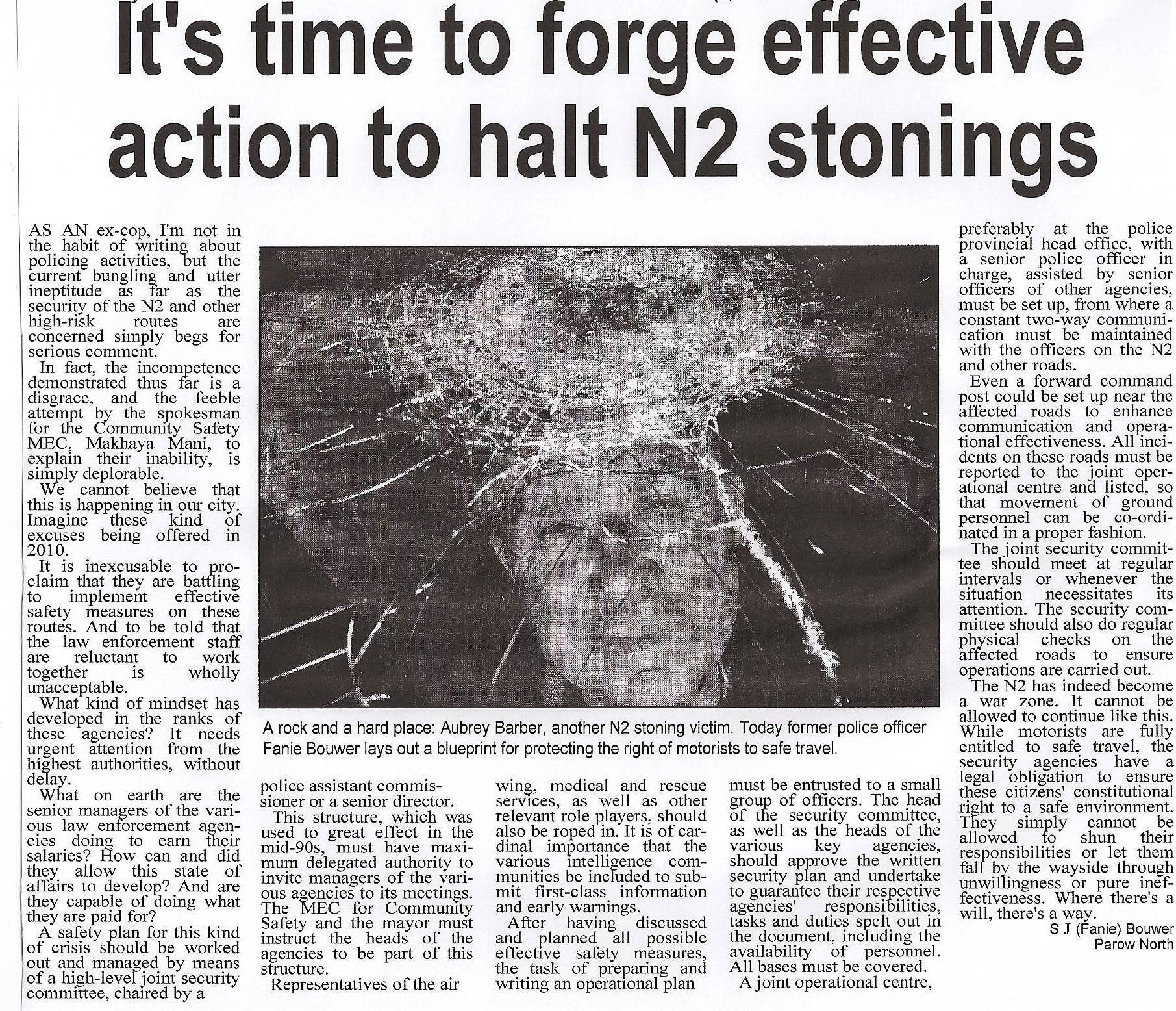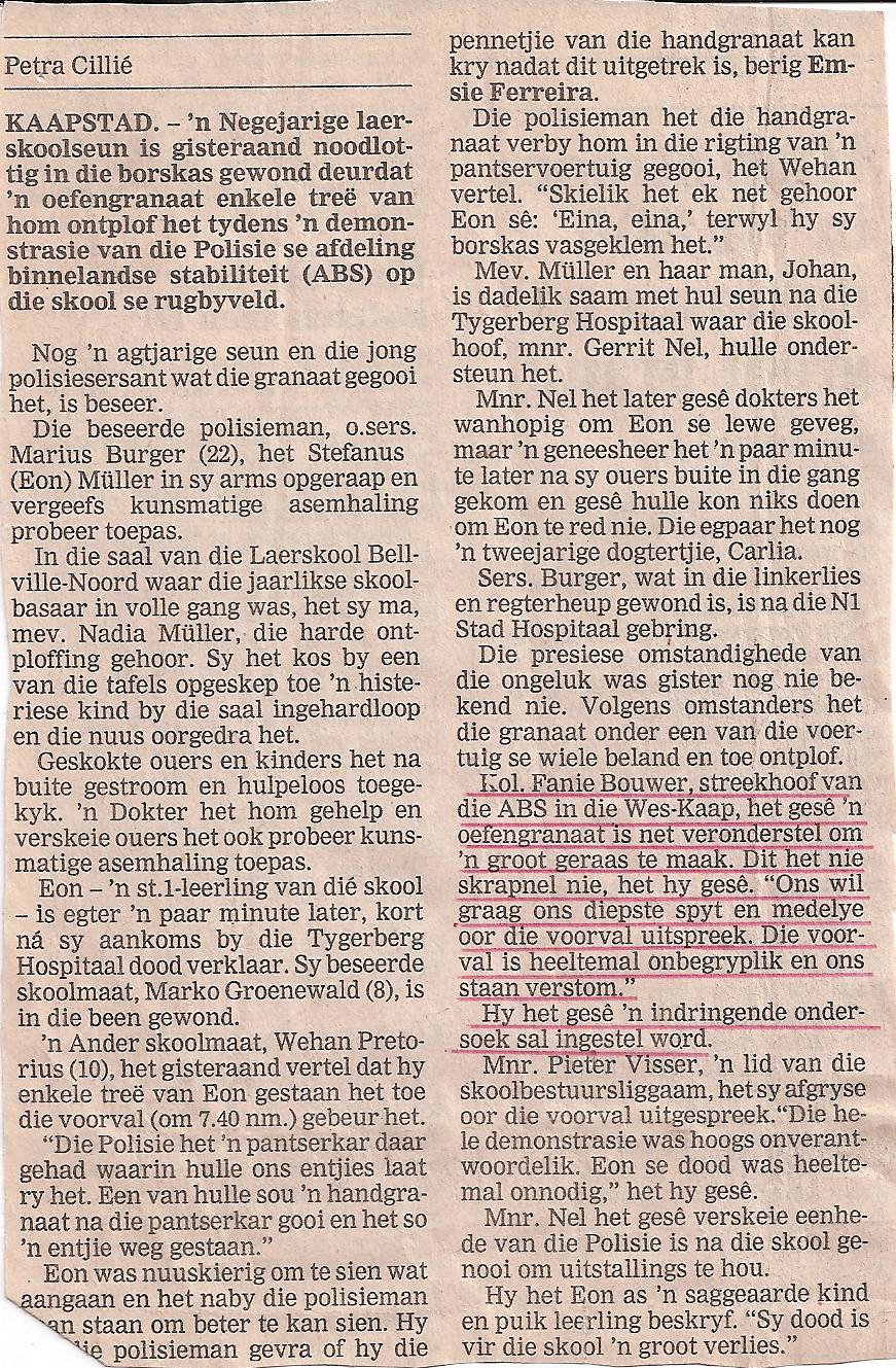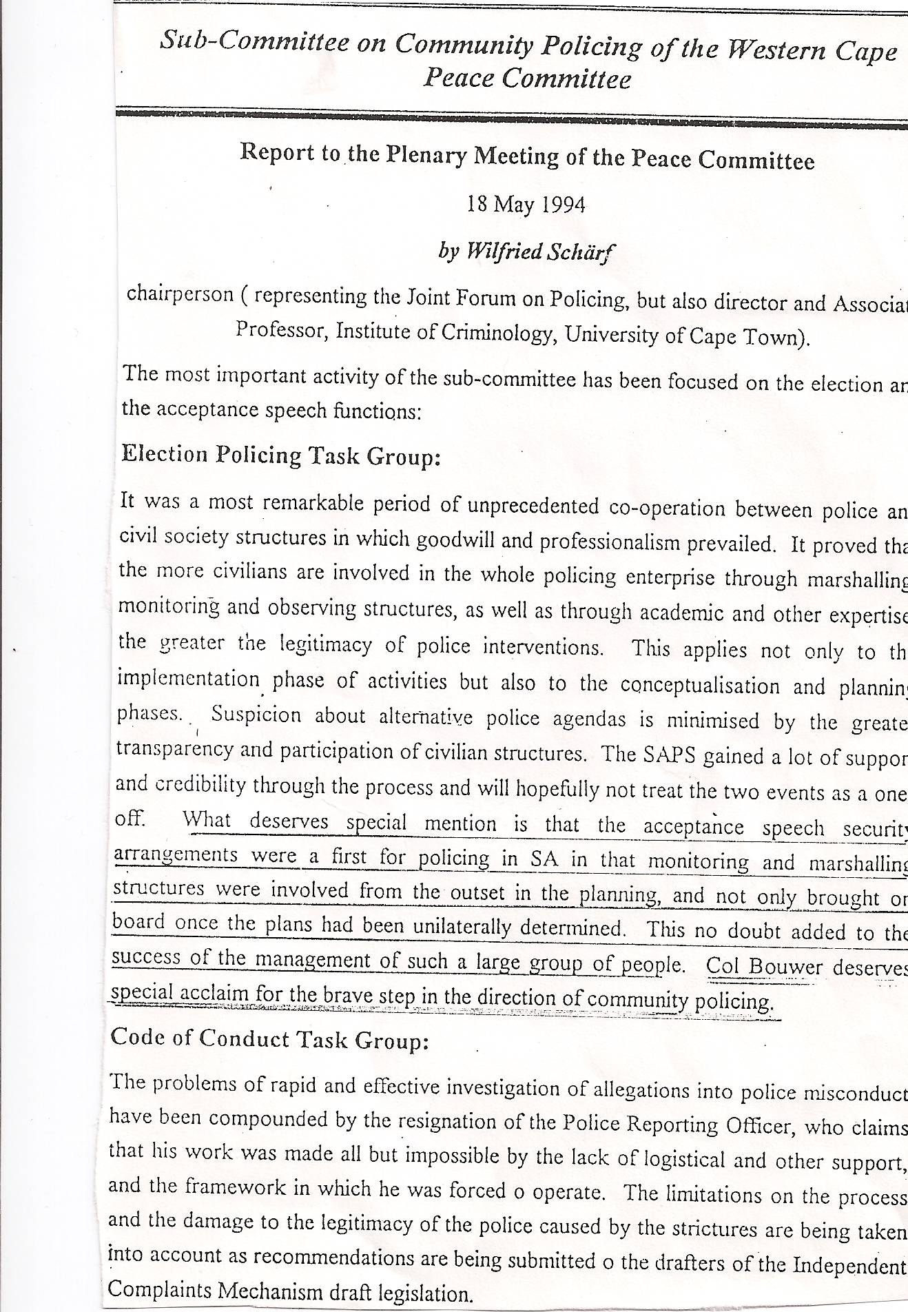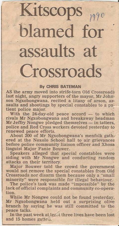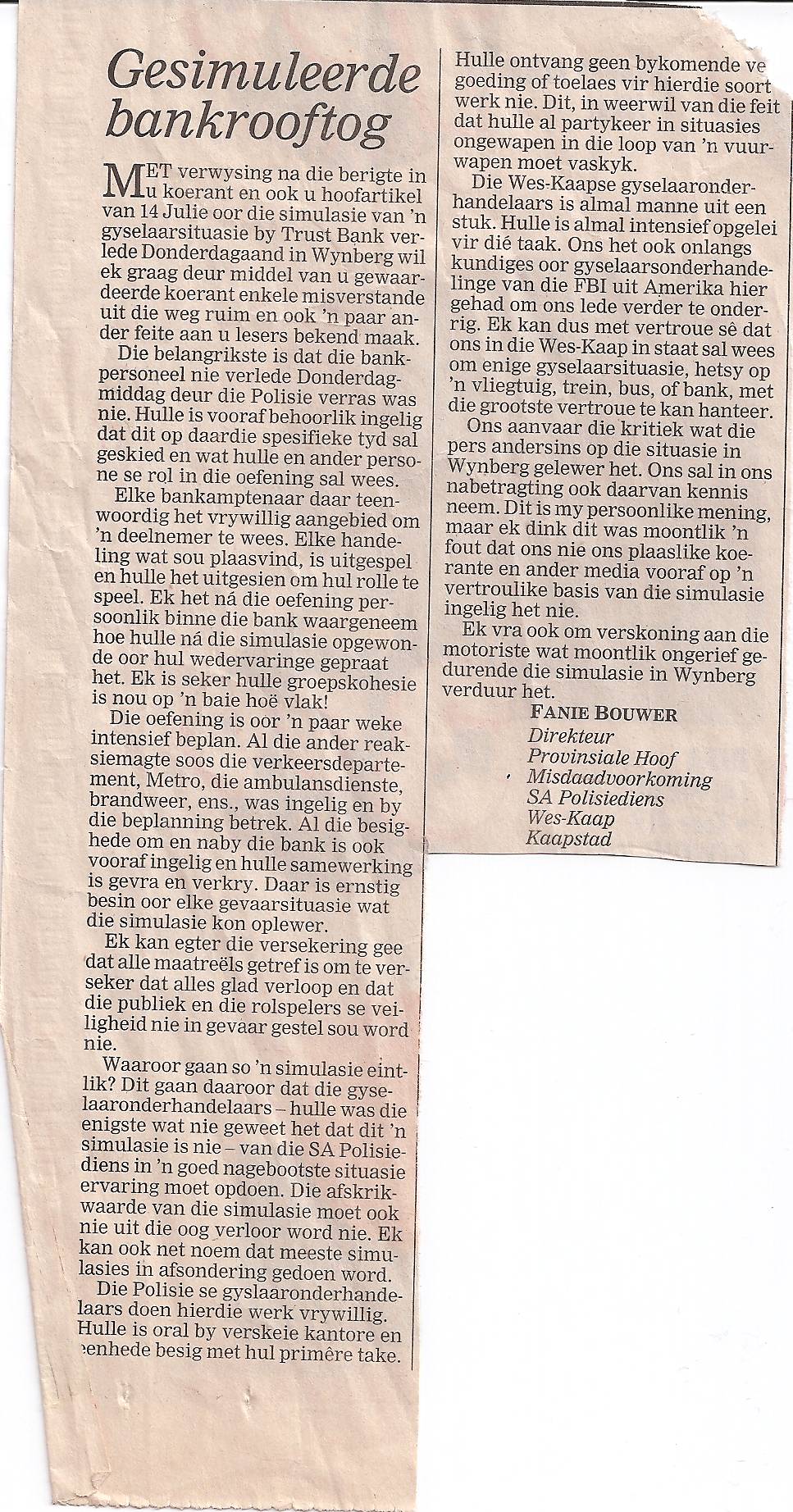 Die Redakteur van die Cape Argus koerant verwys hierbo na my stelling oor die samewerking van die gemeenskap in die voorkoming van geweld in daardie moeilike dae – 1993. Lees laaste 2 paragrawe hierbo.