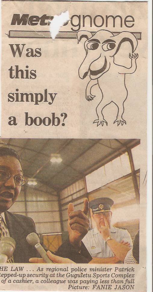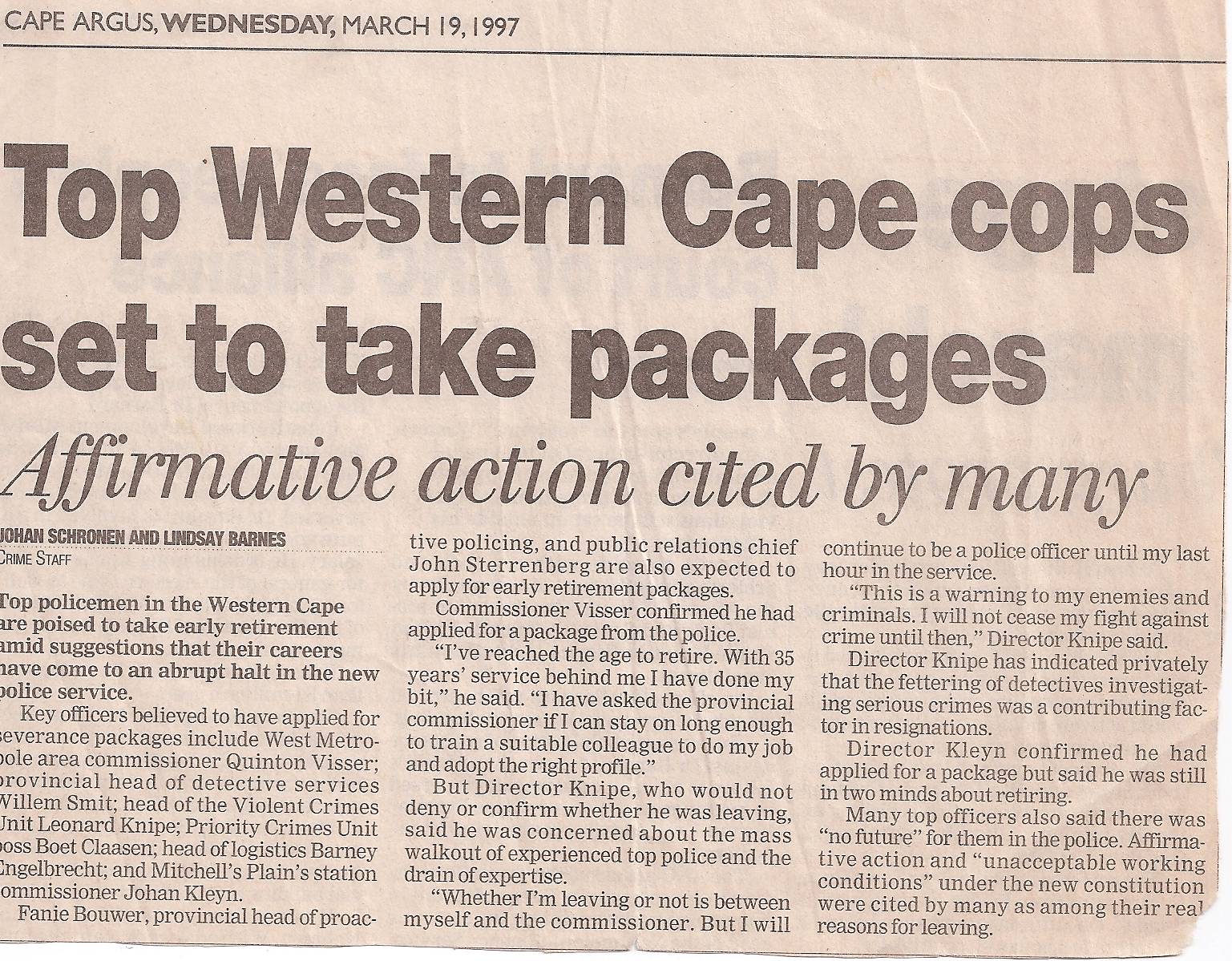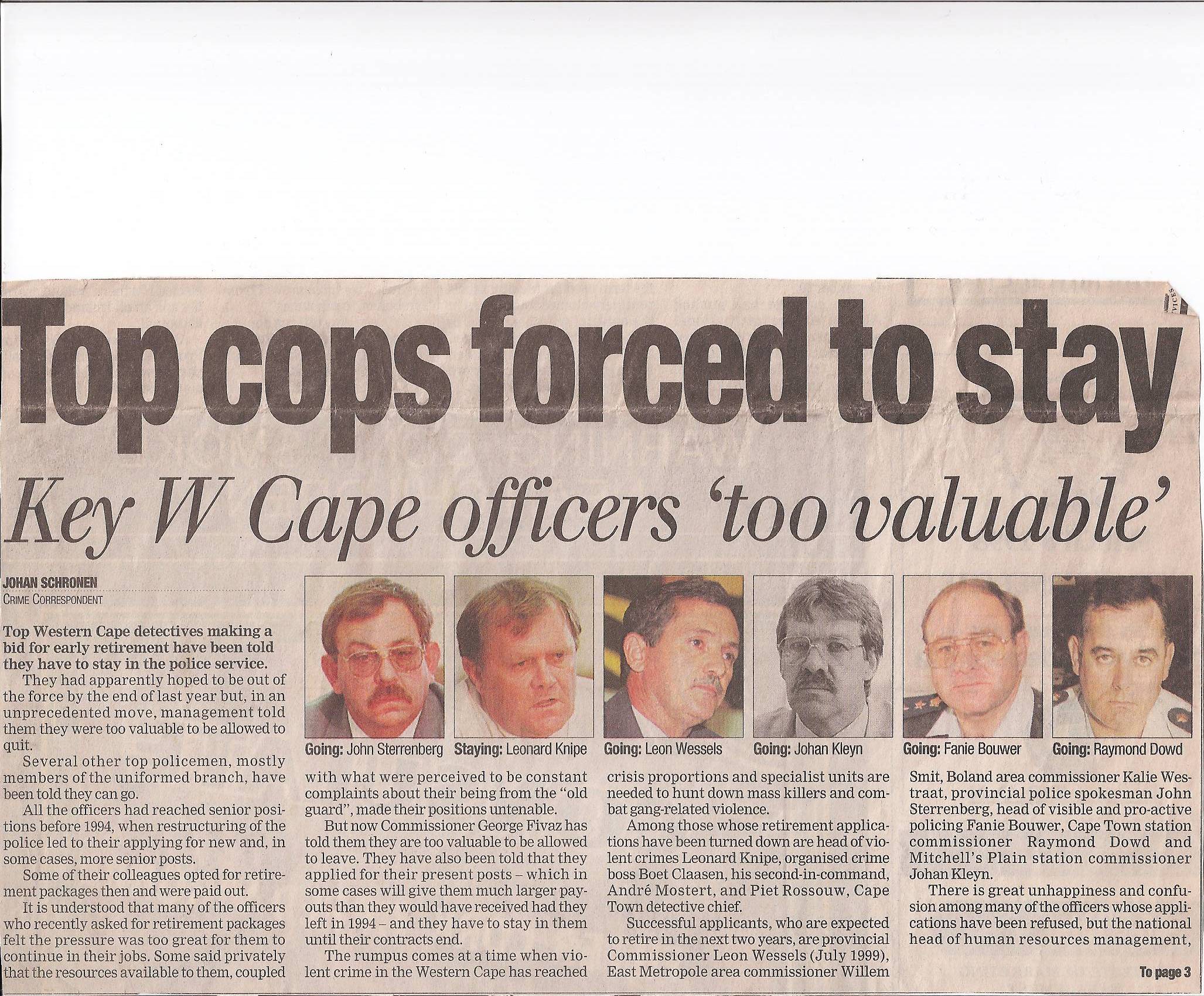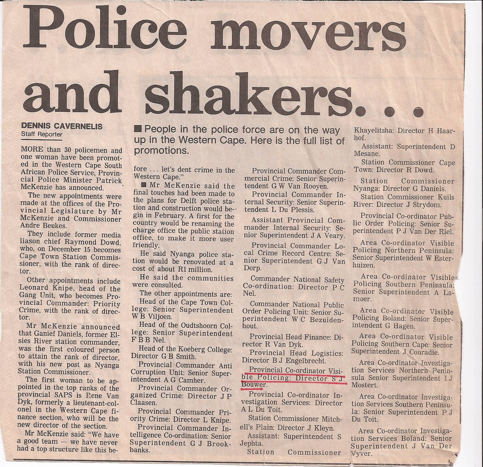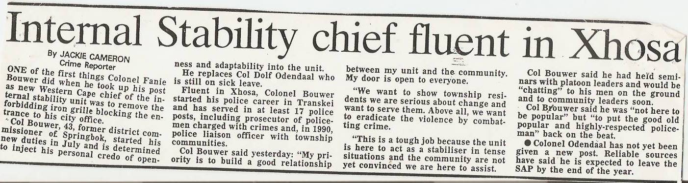 My aanstelling as Provinsiale Hoof van die Afdeling Binnelandse Stabiliteit in die Wes-Kaap was nogal taamlik nuuswaardig gewees. Ek was voor dit in Namakwaland gewees met Springbok as my Hoofkantoor. Julie 1993.