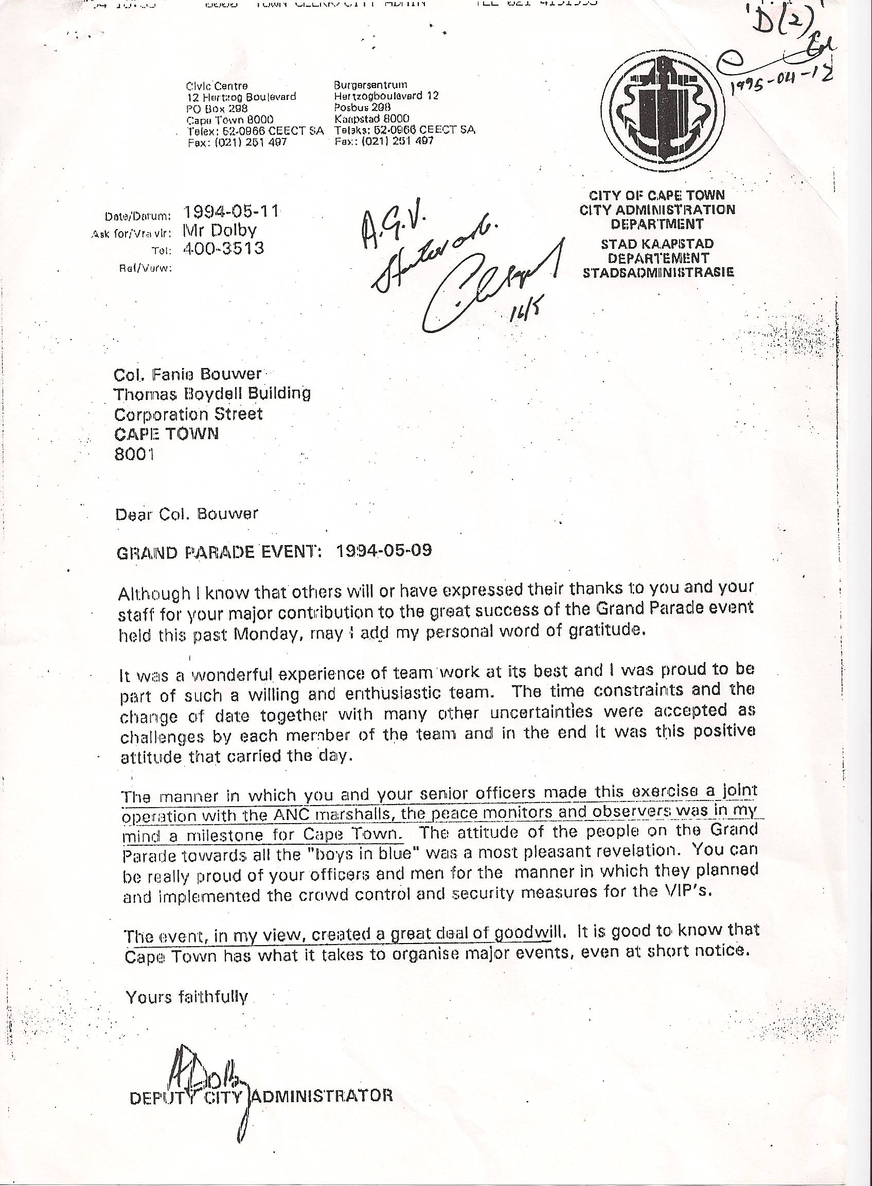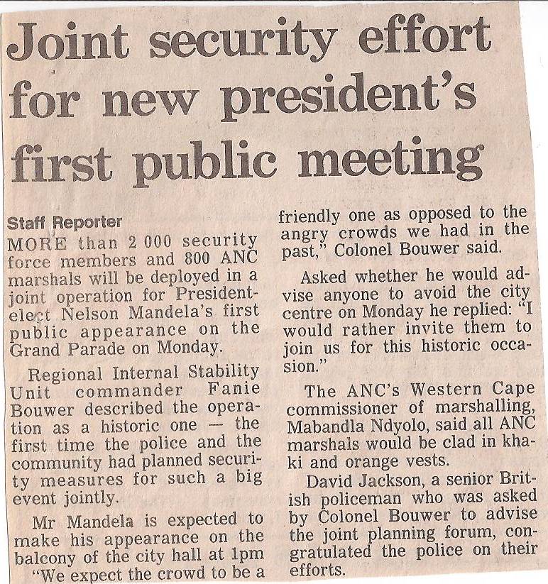 Dit was een van die ingewikkeldste veiligheidsbeplannings wat ek ooit gedoen het. Tog goed afgeloop. Daar was toe ongeveer 120 000 mense op die Kaapse Parade gewees vir hierdie geleentheid.