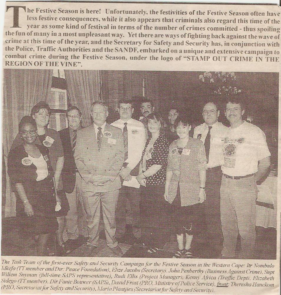 Ek was Voorsitter van ‘n taakspan – wat lede van die Provinsiale regering ingesluit het – wat ‘n veiligheidsplan in die Wes-Kaap opgestel het – 1996
