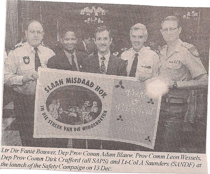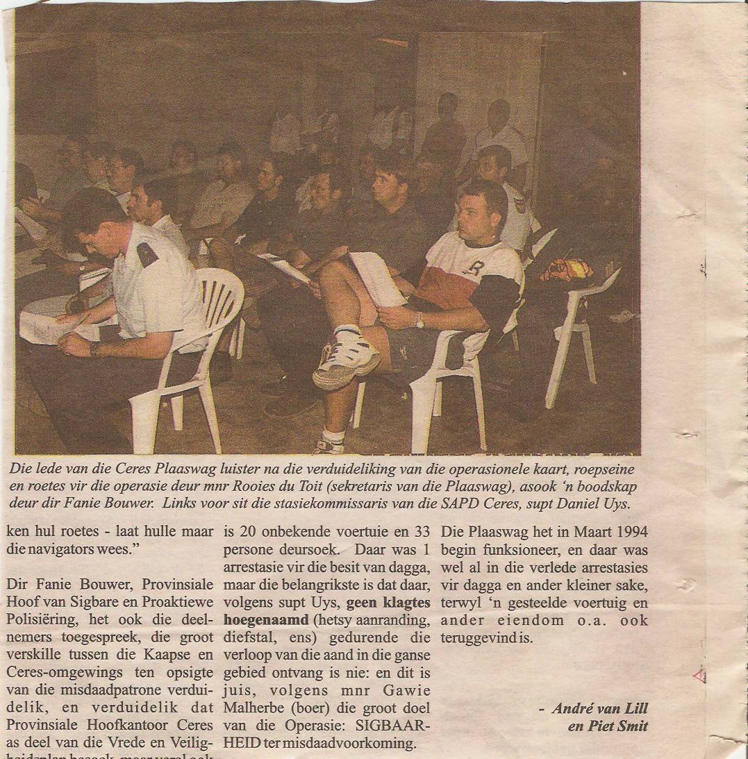 Ek het hier met die boere oor veiligheid gaan praat in Ceres in die Boland en sommer ‘n misdaadoperasie saam met hulle gehou – 1997. Ek het besoeke oral oor in die Wes-Kaap gebring.