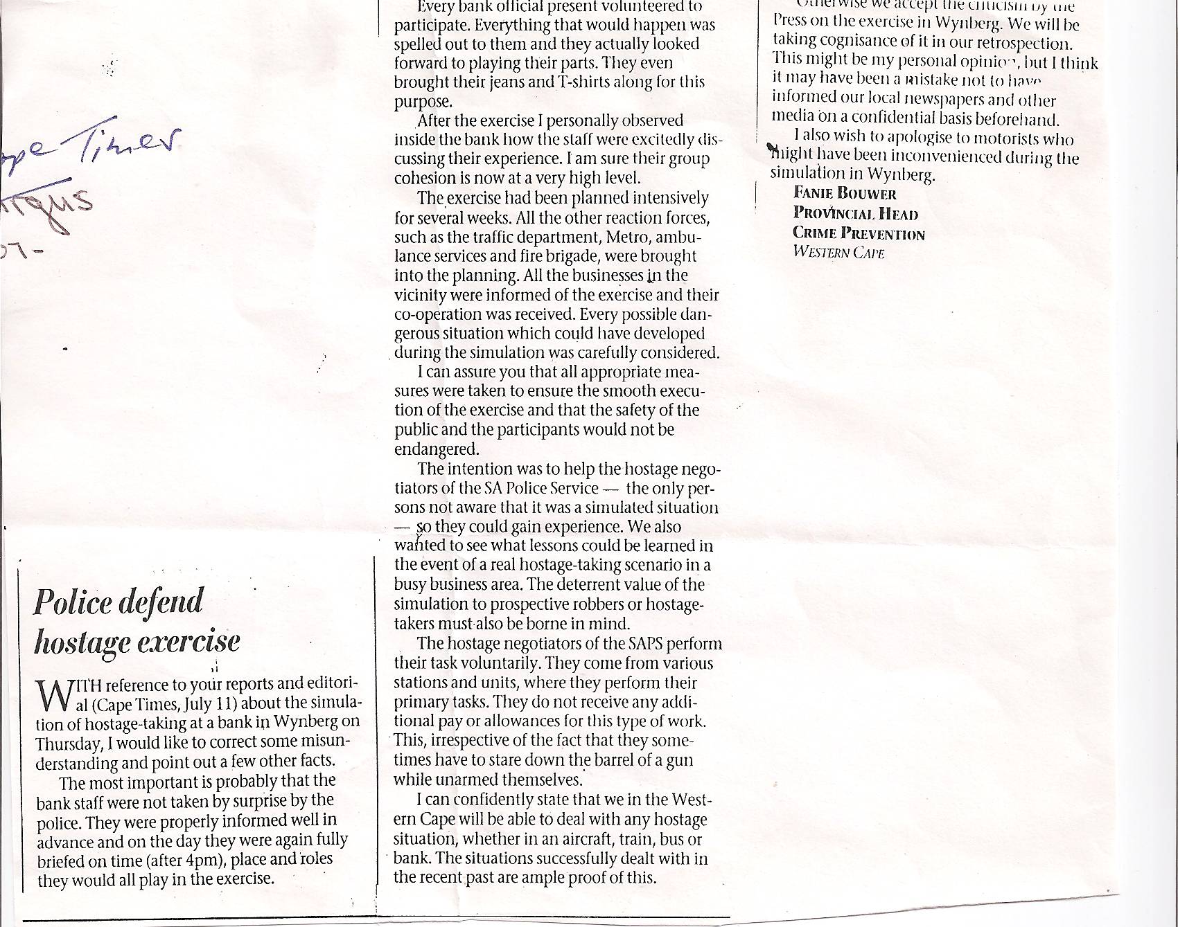 Ek verdedig die koerante se kritiek teen ons oor die oefenlopie wat my Gyselaar-Onderhandelaars gehou het. Die koerante het ons omtrent gas gegee! Seker maar omdat ons hulle nie voor-af laat weet het nie – die boggers!.