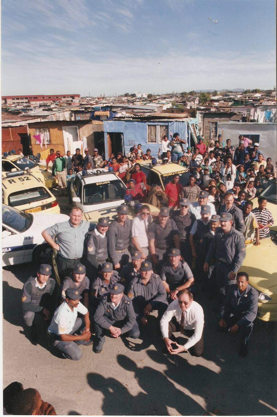 Ek hurk hier regs voor (met wit hemp en das) met lede van die Blitspatrollie toe vir die eerste keer in Khayelitsha gaan patrolleer het. Die nuuskierige inwoners drom om ons saam.