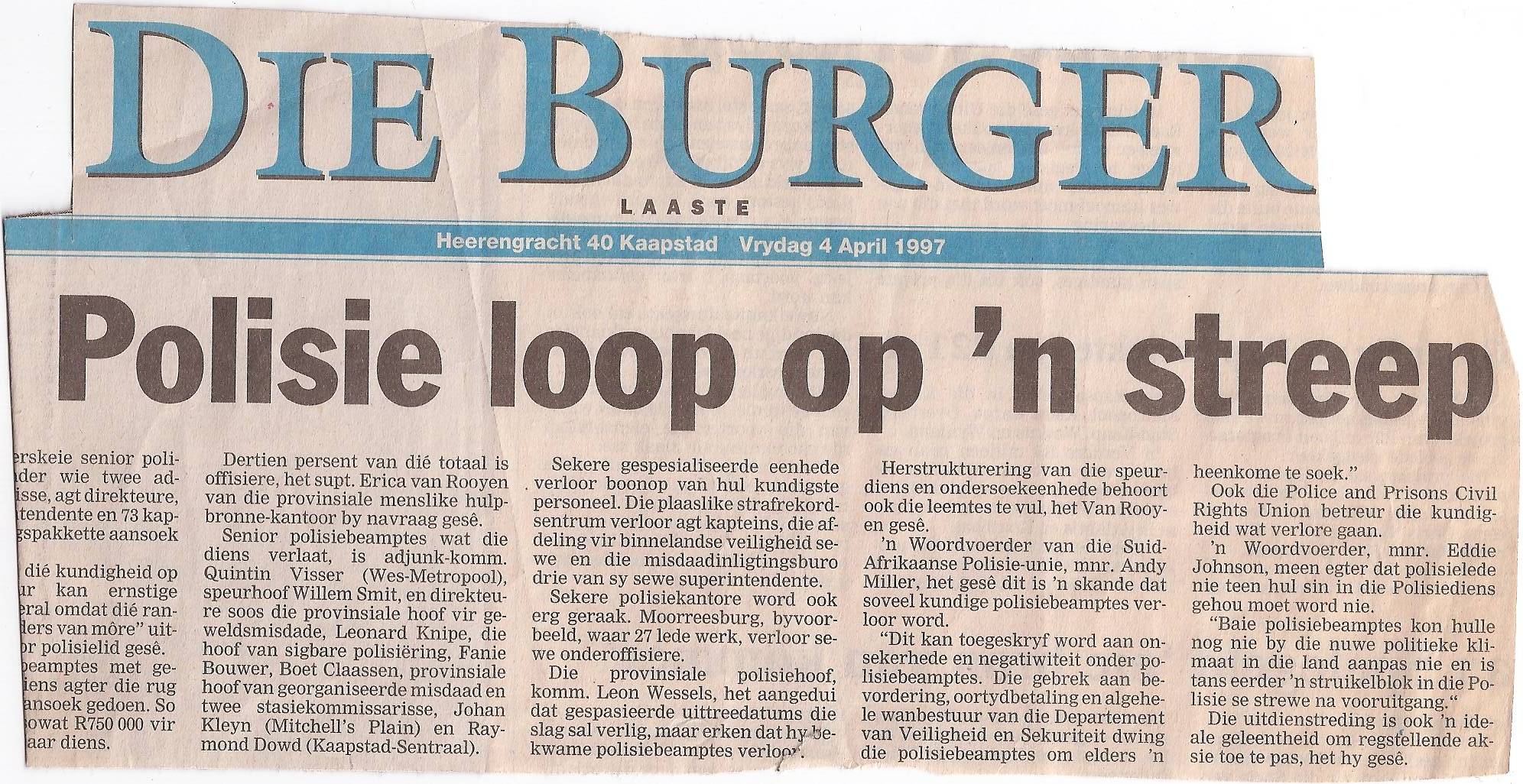 Nog ‘n artikel in Die Burger toe ek aangestel is as Provinsiale Hoof: Binnelandse Stabiliteit in Julie 1993