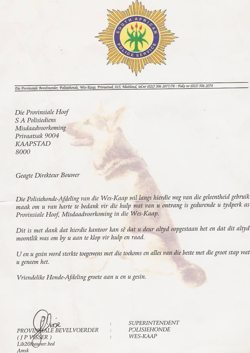 Ek het altyd gedink dat die Honde-Eenhede se ouens van die gedissiplineerdste was – nes hulle honde!. Hierdie brief van hulle wys hulle klas.