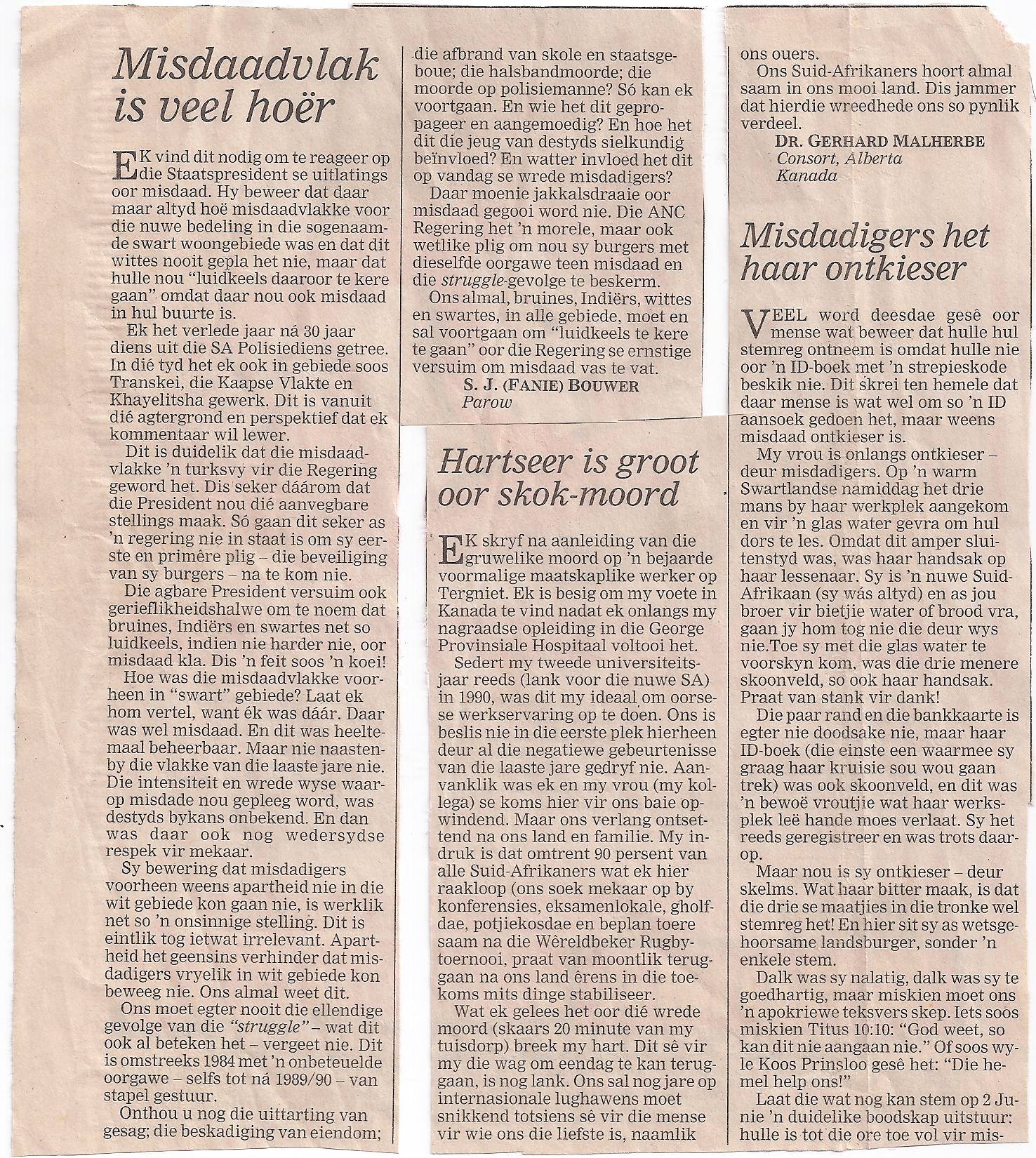 Ek reageer in hierdie brief op President Mandela se stellings destyds oor misdaad in SA en gee ‘n bietjie perspektief oor die eintlike oorsake
