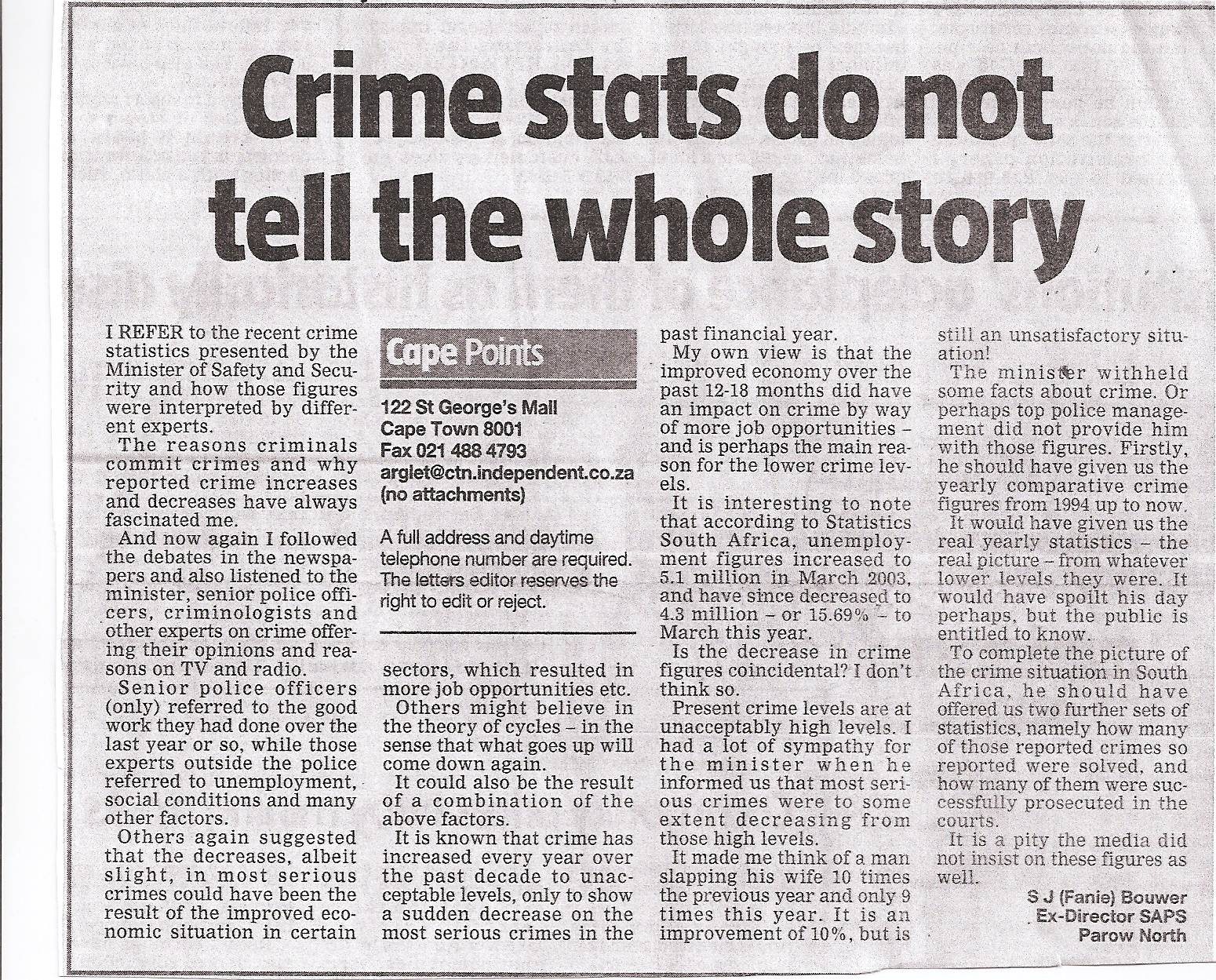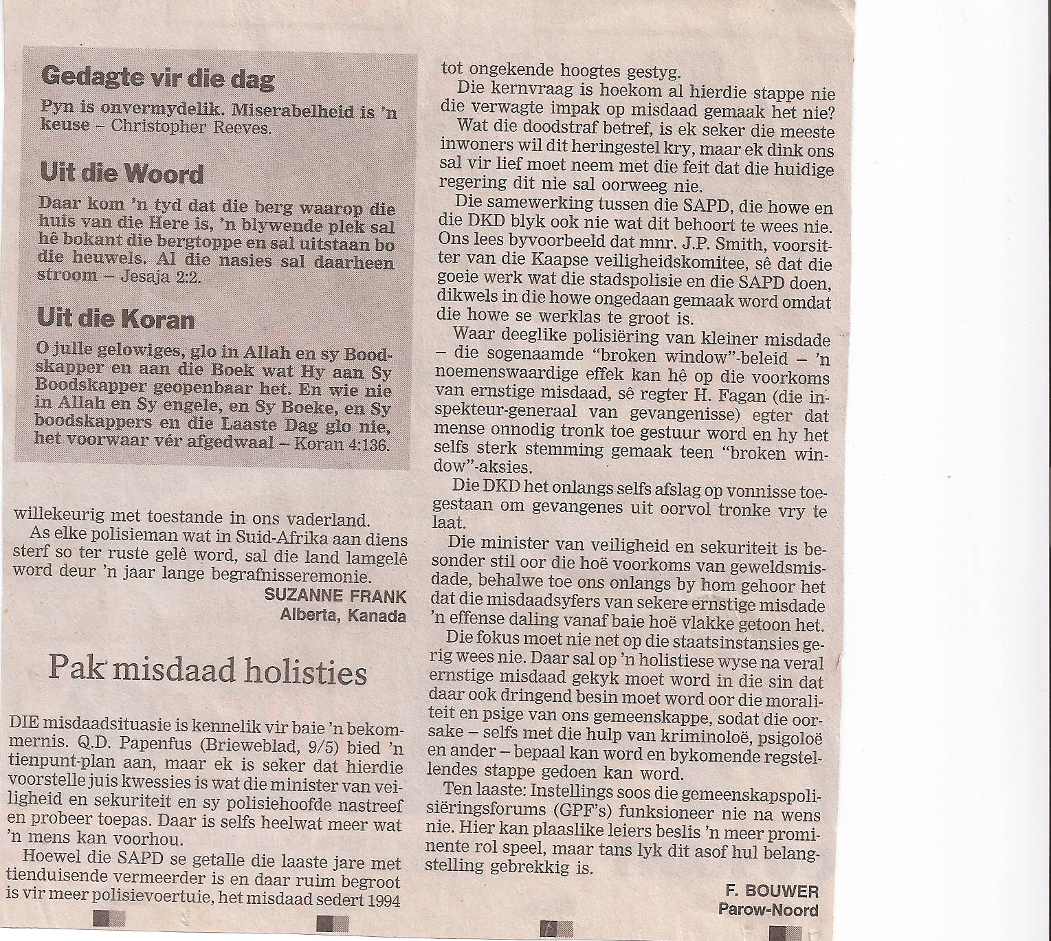 Nadat ek bedank het, hou ek maar uit die aard van die saak die misdaadsituasie dop en, waar nodig, skryf ek aan die koerante om my mening oor dít, en die Polisie self, te gee. ‘n Paar briewe volg hieronder.