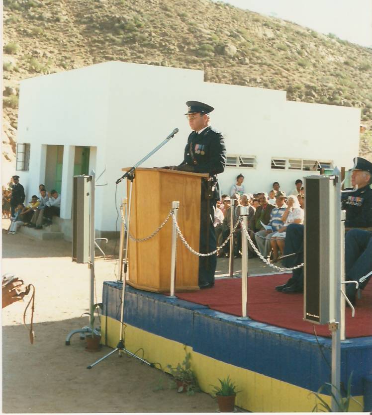 Ek maak ‘n toespraak tydens die opening van Kommagas polisiestasie in Mei 1992 in die ‘gopse’ van Namakwaland. Slegs kleurlinge woon hier.