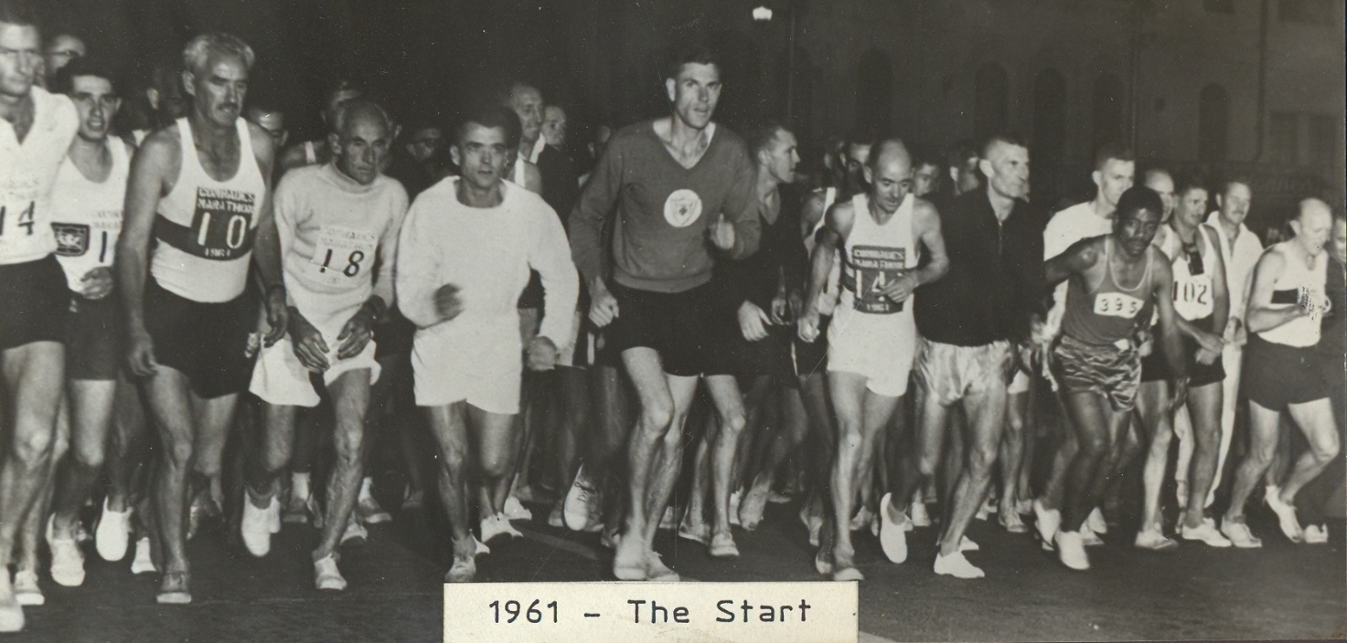 Warrant Office OD Moorcroft (Dark top and black shorts) the first South African Police member to attempt the Comrades Marathon