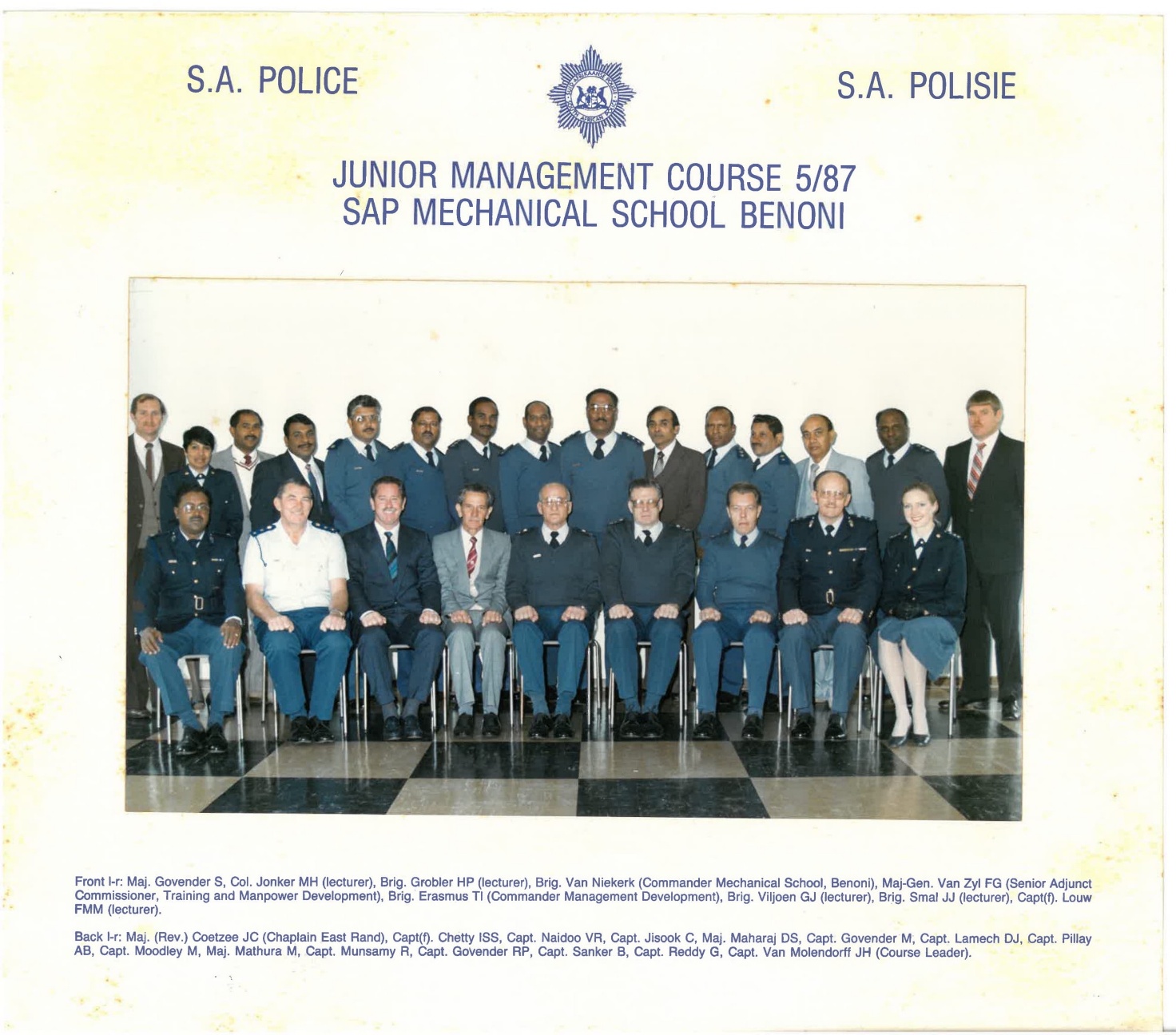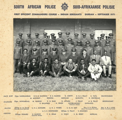 Rear row, standing, from left to right, 1st Unidentified; 2nd RP Govender; 3rd Unidentified; 4th Morgan Chetty (Deputy National Commissioner, Lieutenant General – [LG]); 5th S Moodley; 6th Soobramoney Govender; 7th Manikum Govender; 8th Unidentified; 9th JM Manual, (Deputy Commissioner, Lieutenant General. [LG]); 10th Perumal Moodley.