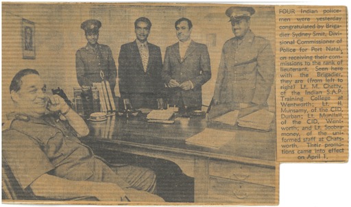 “Four Indian policemen were yesterday congratulated by Brigadier Sydney Smit, Divisional Commissioner of Police for Port Natal, on receiving their commissions to the rank of lieutenant. Seen here with the Brigadier, they are (from left to right) Lieutenant M Chetty of the Indian SAP Training College at Wentworth; Lieutenant H Munsamy of the CID, Durban; Lieutenant Munilall of the CID, Wentworth; Lieutenant Soobramoney, at the uniformed staff at Chatsworth. Their promotions came into effect on April 1.”