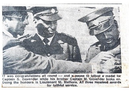 “It was congratulations all around – and a pause to adjust a medal for Captain S Govender while his brother Captain M Govender looks on. Doing the honours is Lieutenant Munilall (Ray) Mathura. All three received awards for faithful service.”