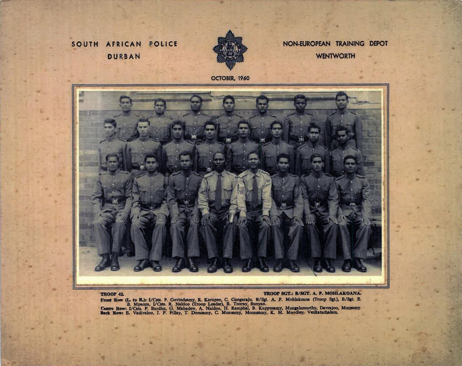 In 1961, history was made when the first Indian instructors were appointed at the South African Police Non-European Training Depot in Wentworth, Durban. Among them were Lance Sergeants Ray Munilall Mathura and Munsamy. They served under the command of Warrant Officer Odin Audley Moorcroft with Platoon 01 in July 1961.