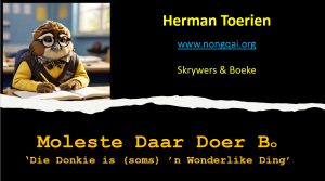 Die donkie is (soms) ‘n wonnerlike ding! Seuns (en soms jong manne ook) beleef mos ‘n fase in hul lewe waar hulle ‘n onblusbare lus het om donkie te ry… al word daai lus binne ‘n minuut of wat geblus. Herman Toerien Min mense wat al paaie met ‘n donkie gekruis het, het nie ‘n … Continue reading Nongqai Skrywers & Boeke: Die Donkie is (soms) ‘n Wonderlike Ding!
