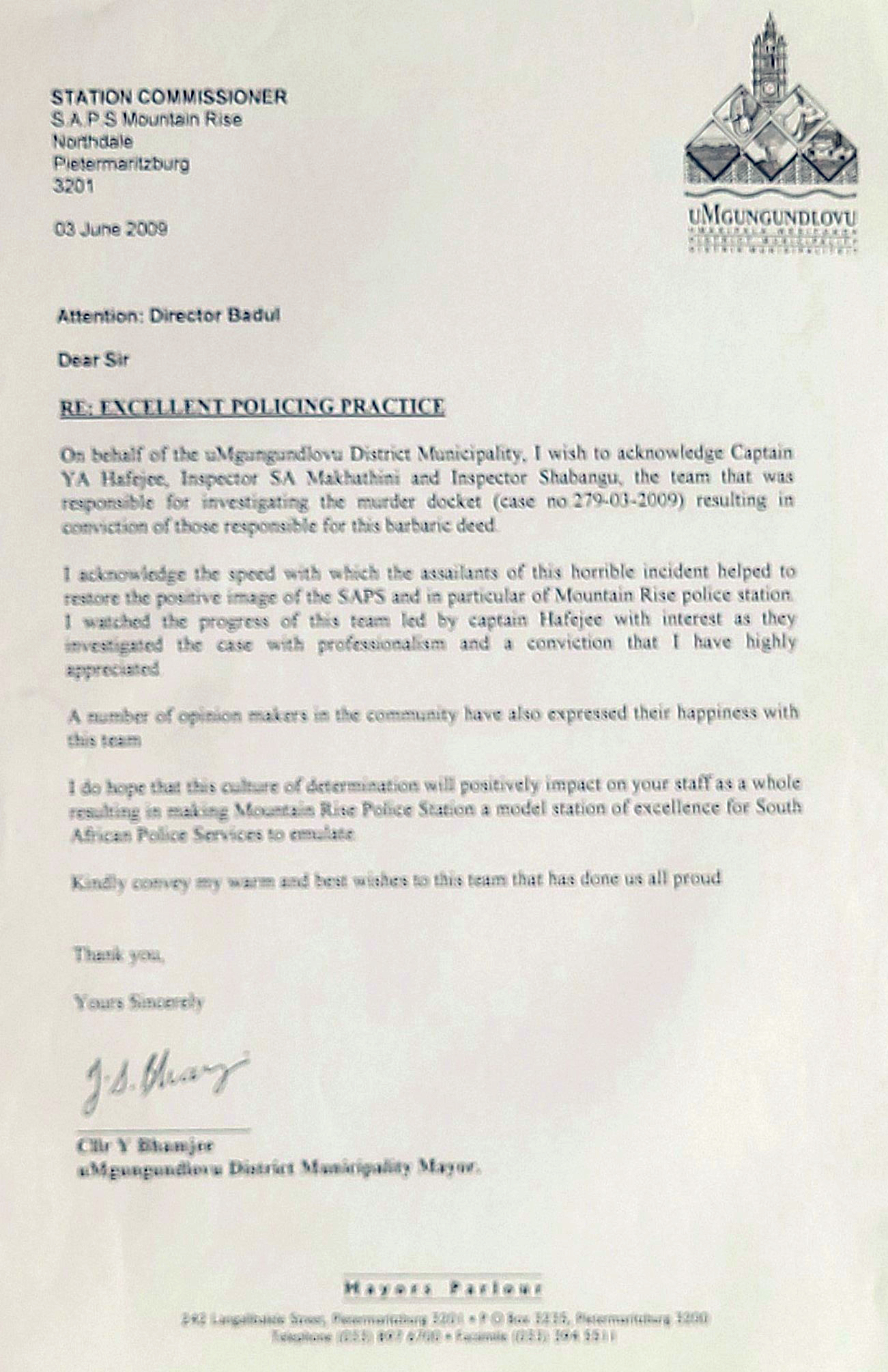 Lieutenant-Colonel Haffajee combined professional skill with humility and compassion. He is truly an officer and a gentleman, with a good sense of humour. He believed in calm discussion rather than force, understanding that respect and patience were powerful tools in finding the truth. This approach earned him the trust of both victims and colleagues. He often worked late into the night and over weekends to make sure justice was done.