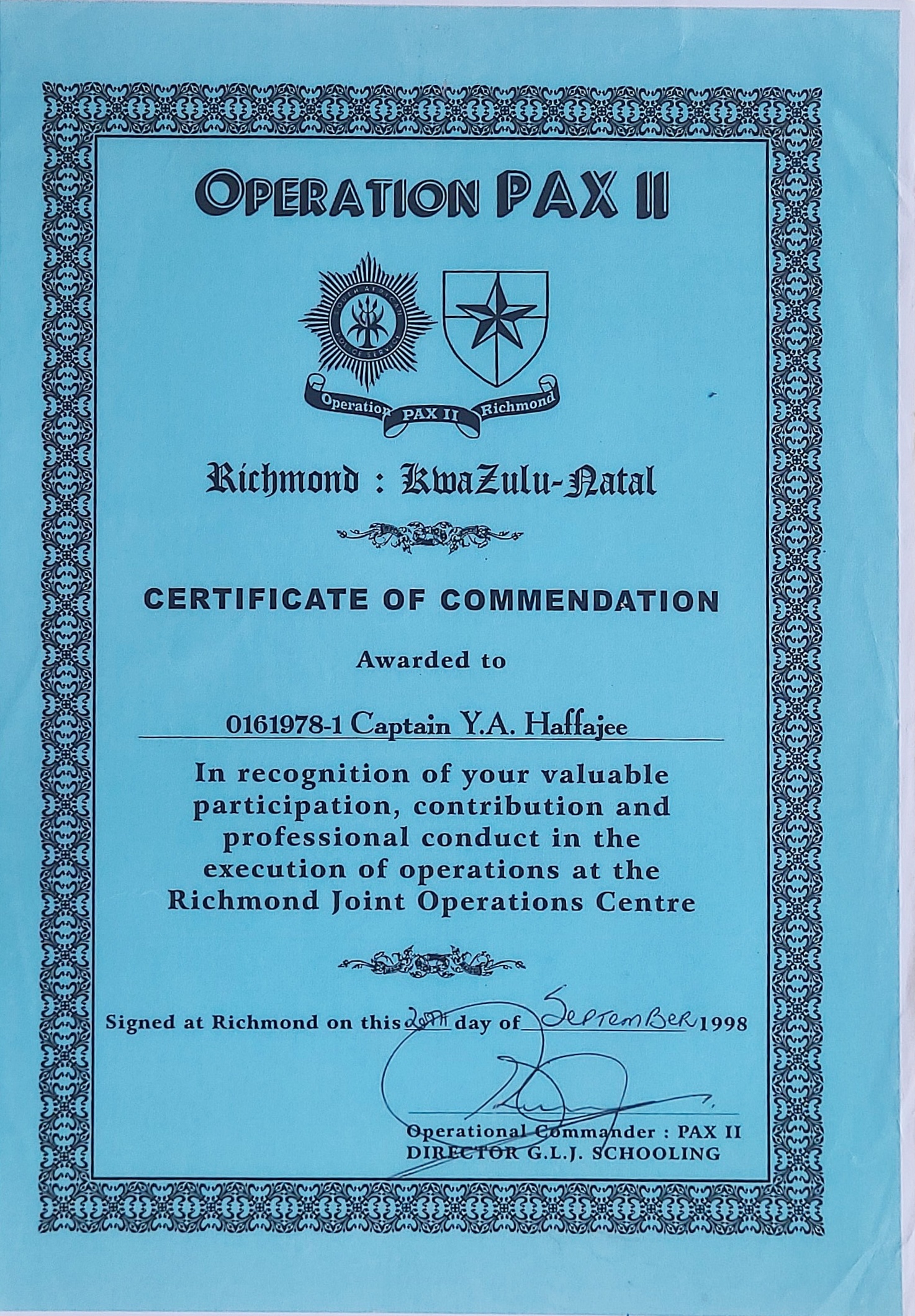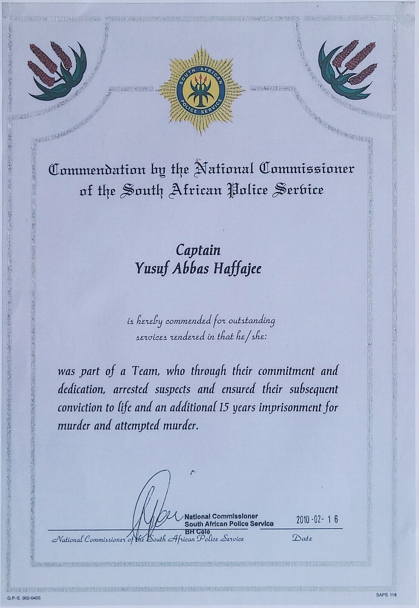 Lieutenant-Colonel Haffajee’s career has left a lasting impact on the South African Police Service and the communities of KwaZulu-Natal. Over the years, he helped investigate and solve several serious and high-profile cases in Pietermaritzburg. His work led to arrests and convictions, bringing justice to grieving families and strengthening public trust in the police. He was also awarded Commissions by the National Commissioner of the South African Police Service in recognition of his service.