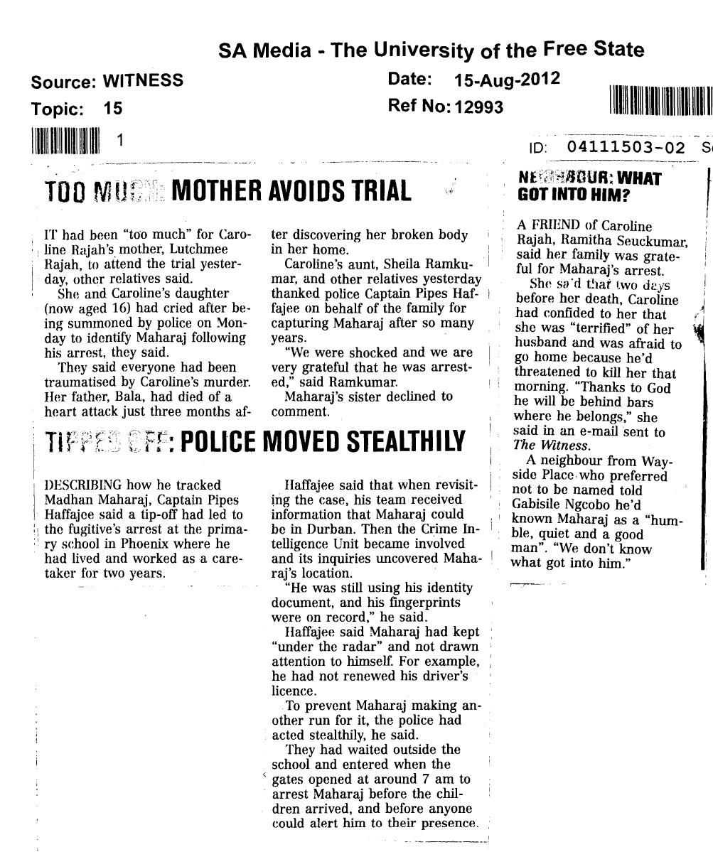 He said one of the cases that stands out most for him was the arrest of Madan Maharaj, a man who brutally murdered his wife, Caroline, in 2005 before escaping custody and fleeing to Durban where Haffajee traced him in 2012, seven years after the incident.