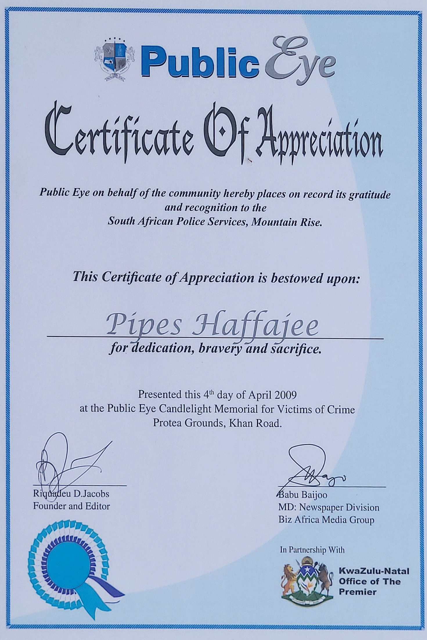 A special ceremony was held yesterday for Mountain Rise’s go-to man for tracing hardened murderers – Captain Yusuf “Pipes” Haffajee – on his last day as an officer of the law.
