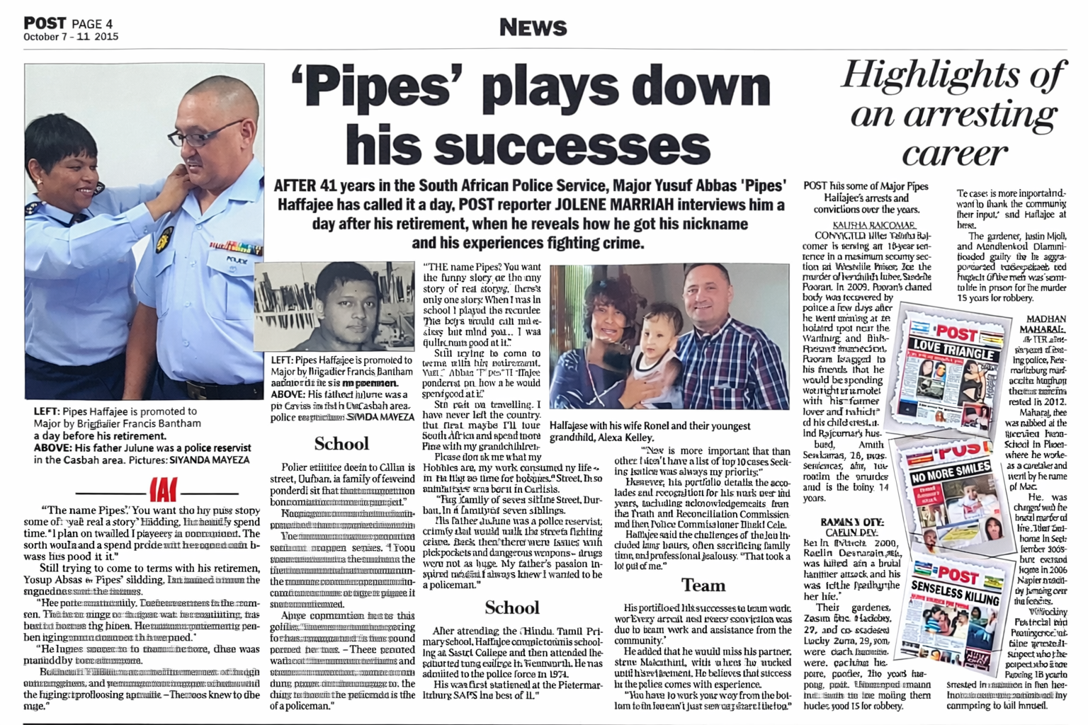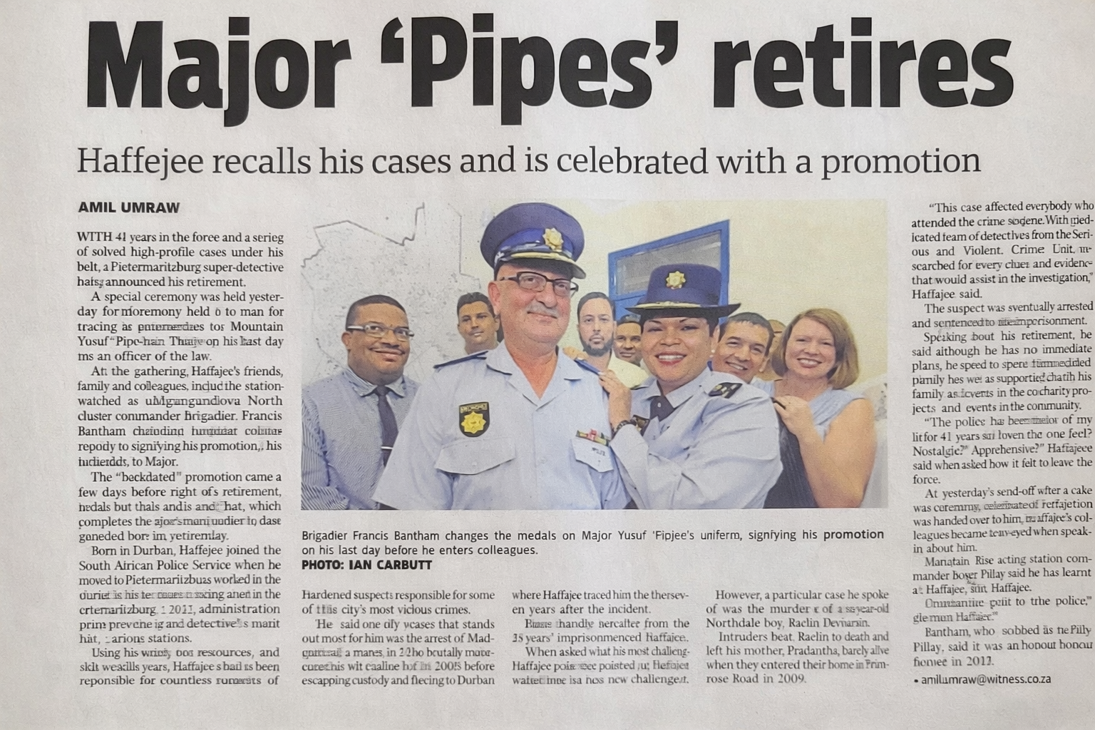 The dedication, commitment, and distinguished 40-year police career of top Detective Lieutenant-Colonel Pipes Yusuf A Haffajee was widely celebrated by many media houses in KwaZulu-Natal. Billboards across the province proudly marked his retirement, honouring his remarkable service.