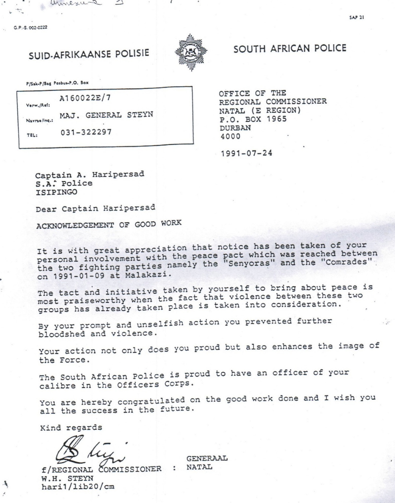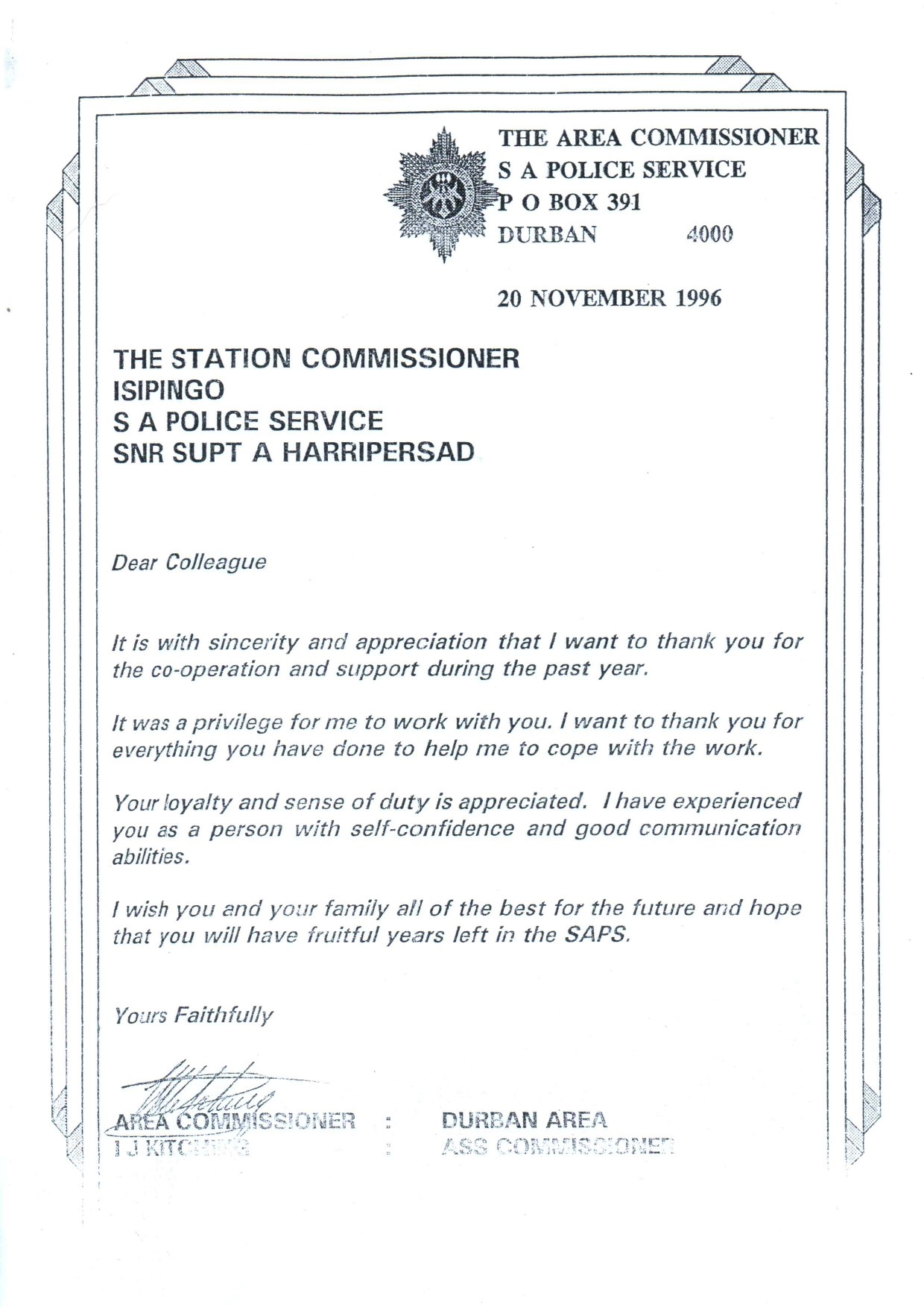 In recognition of his outstanding work, Captain Haripersad received a formal acknowledgement from General WH Steyn, the Regional Commissioner of the South African Police in Natal. Such recognition was not easily earned during that time and demonstrated the high regard in which his actions were held.