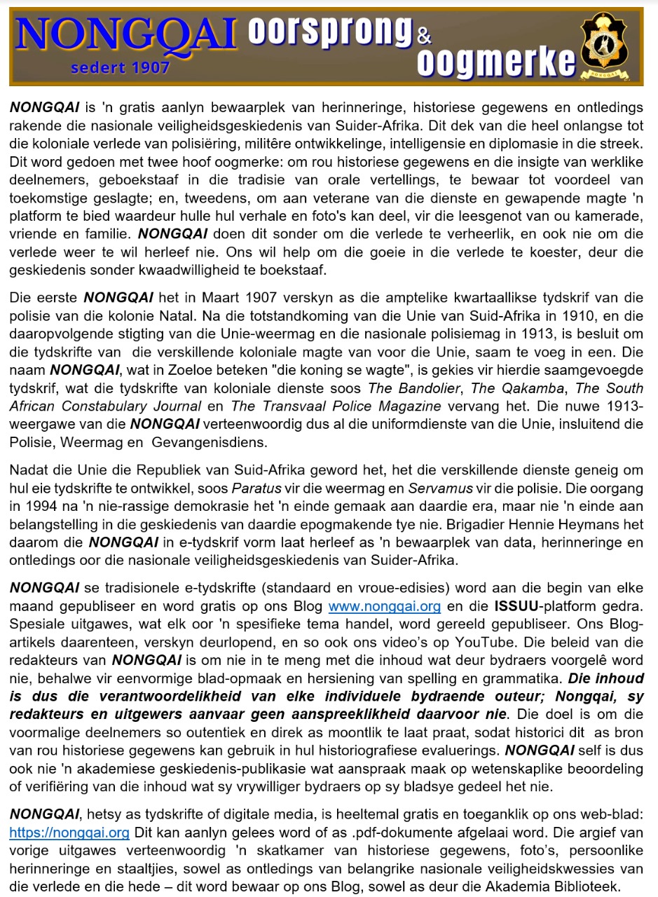 Nongqai (“die koning se wagte in Zoeloe”), se missie is akkurate geskiedskrywing – dit wat regtig in en met Suid-Afrika se veiligheidsmagte gebeur het en daagliks, weekliks en maandeliks aan die gebeur is. Ons vertel die stories en plaas die fotos’ van toegewyde misdaadbestryders, dapper soldate, vindingryke spioene, spraaksame diplomate en wetstoepassers wat hul lewens toegewy het aan dienslewering en diens aan die staat. In hierdie konteks en om hierdie rede nooi ons al ons lesers om skryfwerk oor ons taal, kultuur en landsgeskiedenis enotesiasties voort te siet met nuwe artikels, fotos’, boeke, diepte-artikels, rubrieke en artikelreekse oor die wel en weë van Suid-Afrika se veiligheidsmagte. Stories en artikels oor persoonlike ondervindinge en ervaringe van die lede en gesinne van ons veiligheidsmagte is baie welkom, personalia-stories, staaltjies en kursusse bygewoon, amusante gebeure op diens en kampvuurstories oor die Angolese bosoorlog is almal baie welkom. Stuur artikels en fotos’ na Editor@Nongqai.org, asseblief.