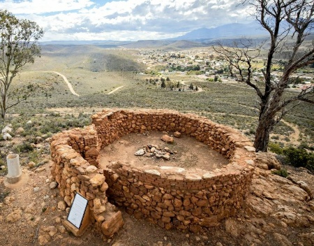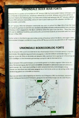 The 10th Hussars, mounted infantry under the command of Lieutenant Colonel WH Williams, entered the town just before 10:00. The immediate task was to bring the town back to normality. Next a “Town Commandant”, Captain R Dippenaar, was appointed and a “Town Guard” was established and speedily rendering the town into a “fortress”. Captain Dippenaar ordered the construction of defensive posts or what he called forts around the periphery of the town on high lying ground. Five small forts were built on the hills around the town which served as observation points to protect the town (four according to some accounts, and Five according to others), four of which are still visible. The forts served as defensive stronghold, providing strategic vantage points over the surrounding landscape. The best-known fort is situated directly above the town in the Uniondale Nature Reserve and was restored by the author Dalene Matthee during her seven-year stay in Uniondale.