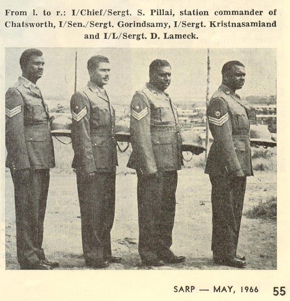 Lt Col S Pillai the first Indian Station Commander of SAP Chatsworth and the first Indian Commander of SAP Wentworth Training College.