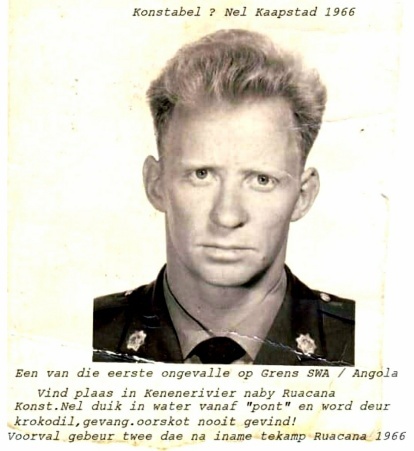 The first member of the SAP COIN Unit to die on active border duty in SWA, was Constable JA Nel, on 07 March 1967. He died in the Cunene river near Ruacana when he jumped off a pont into the river and was killed by a crocodile. Hie remains were never found.
