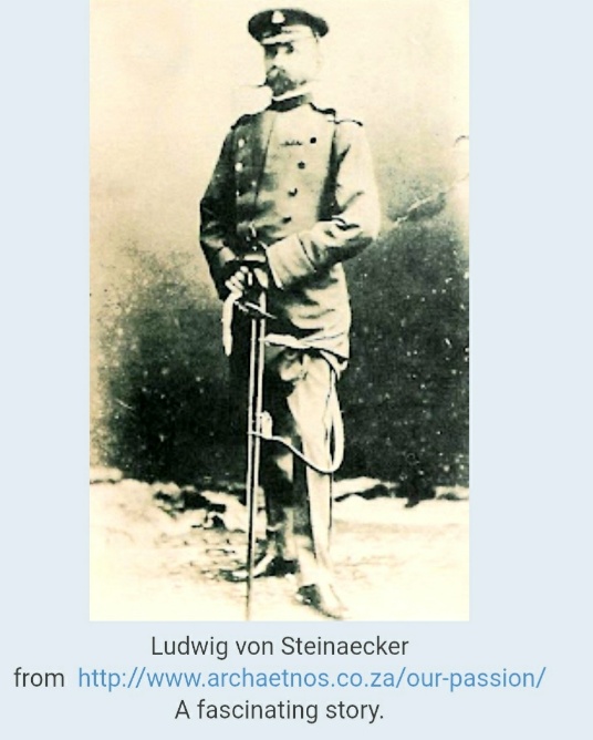 Von Steinaecker was an interesting man. He was a flamboyant, eccentric character who spoke broken English with a strong Bavarian accent. Unconfirmed information states that he claimed that he was sent by the German government to Southern Africa to learn more about Southern Africa. He was described as “small”, only measuring 1.5 m (5 foot), dressed in a flamboyant uniform he had designed himself. The uniform consisted of an officer’s hat bejewelled in silver piping and a broad green band around it. He wore a double breasted khaki-coloured mantel that hung to its knees, equipped with shoulder pads, a slender waistline and finally rounded off with silver tassels. Beside for the unique uniform, he had an even more unique uniform, he had an even more unique long moustache that was a somewhat 10 cm long protruding to that, from either side of his slender bony cheek structure. In addition he had a goatee growing on his chin. Steinaecker had a Napoleonic complex, (short-man-syndrome) and made up for his stature by being a ‘perfectly disagreeable fellow’, ideally suited to the times and place he was in and he had a sort of “Quixotic” sense when fighting, “always wanting to blow up stuff”.
