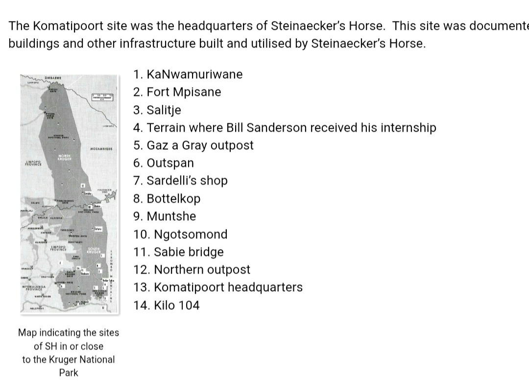 Steinaecker’s Horse unit” (SH) was a volunteer British military unit created by the British Military Intelligence, that fought for the British during the Second Anglo-Boer War or South African War (1899-1902), operating primarily in the Lowveld of the Zuid-Afrikaanse Republiek (ZAR), Swaziland, Mozambique border and the unit was led by a German, Colonel Ludwig von Steinaecker. The unit established outposts, some of which are now within the Kruger National Park, and played a significant role in local history and the early conservation of wildlife in the region. The unit’s main function was border guarding to prevent the Boers from crossing into British territory. It also had an order to destroy the railway bridge over the Komati River. The unit was officially disbanded in 1903 after the war. Colonel von Steinaecker, a flamboyant and complex character, continued to be a figure in the Lowveld before his death in 1917.