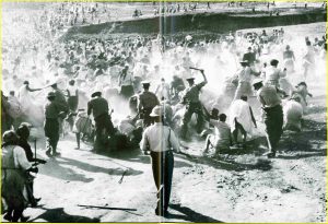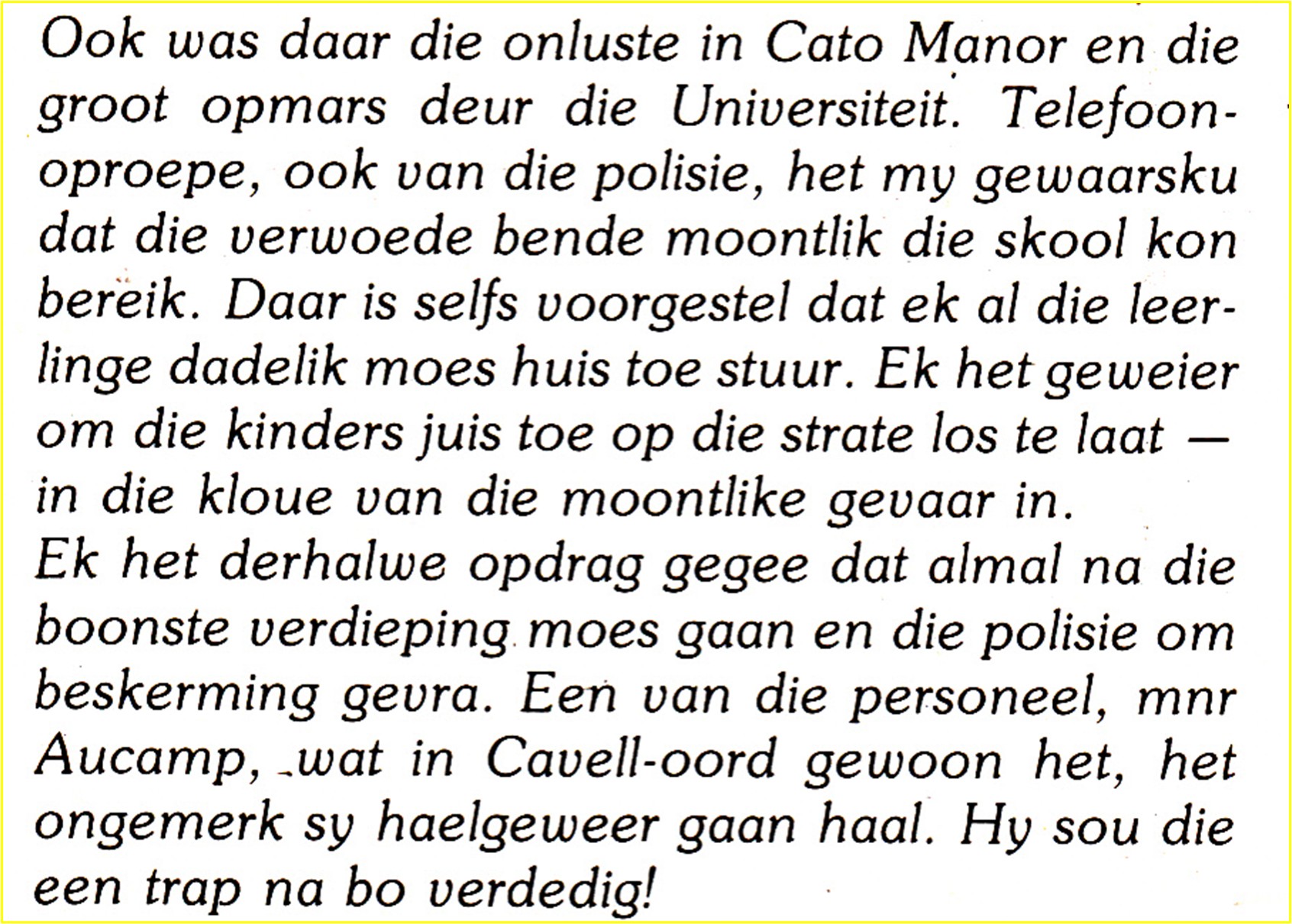 As far as I could see, Cato Manor was even then a keg full of explosives – waiting for the right catalyst to explode at any minute. Various riots took place there – the newspapers were full of it. Major Jerry van der Merwe once appeared on the front page with a bleeding face after a stone was thrown at him, which struck him in the face. All the factors and actors were present, especially over weekends. Various factors were at play. It was just a question of time.