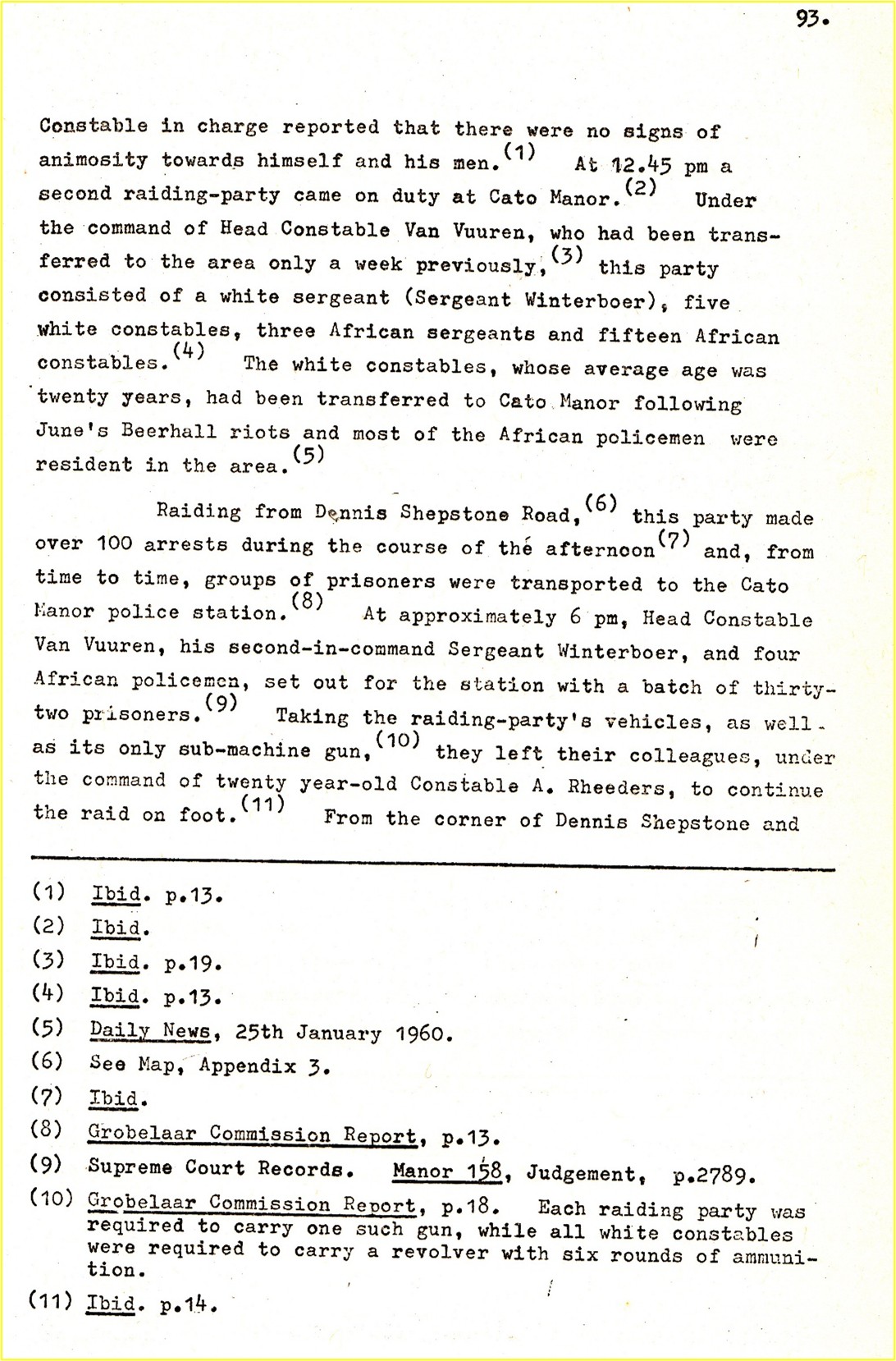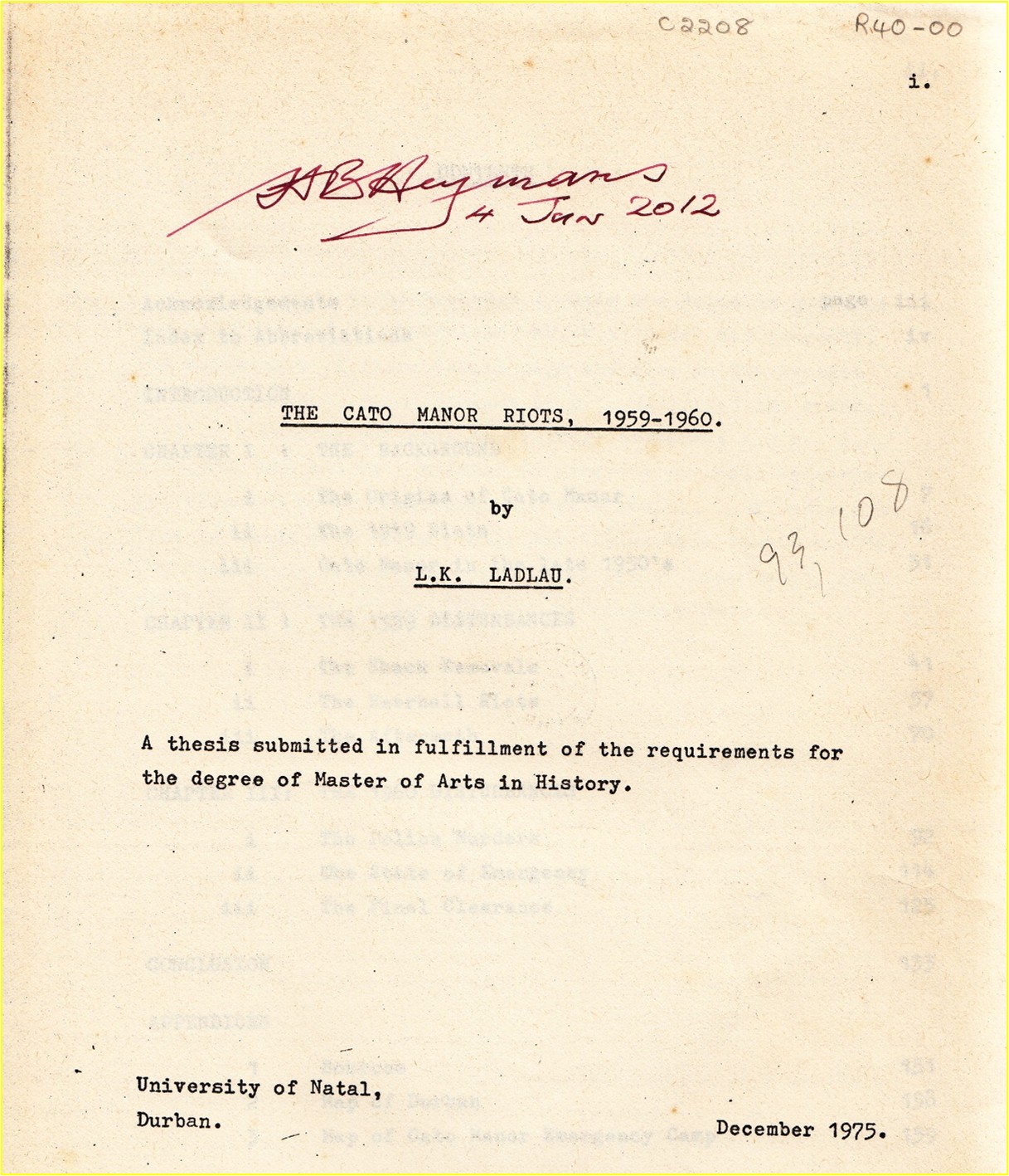 - Ladlau, LK: The Cato Manor Riots, 1959 – 1960, (MA Thesis) University of Natal, 1975.