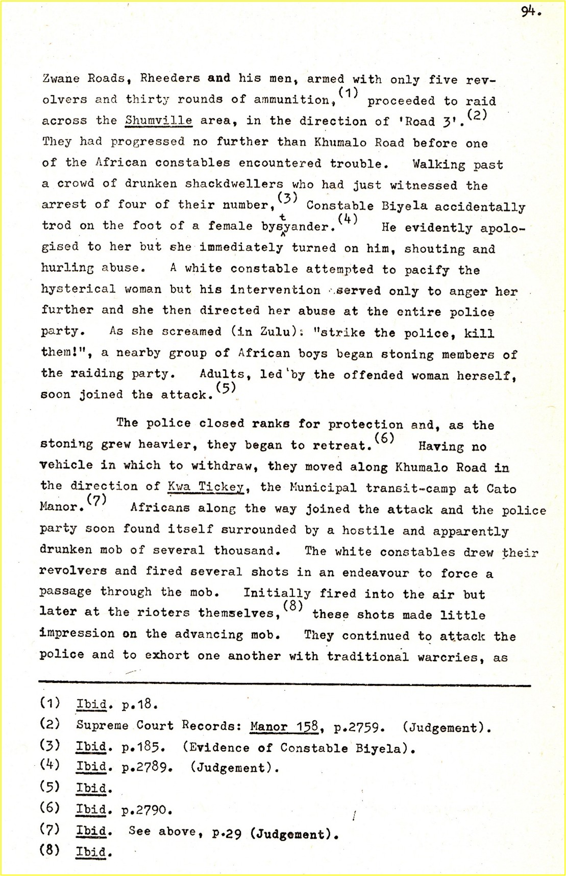 To prove their case, it was ironic that the police in the absence of an official police photographer asked a journalist to take photographs. Bloomfield says there were about 30 policemen facing a large crowd of angry Zulu women and youths. Tyson quotes Laurie Bloomfield who described the events as follows[14]: