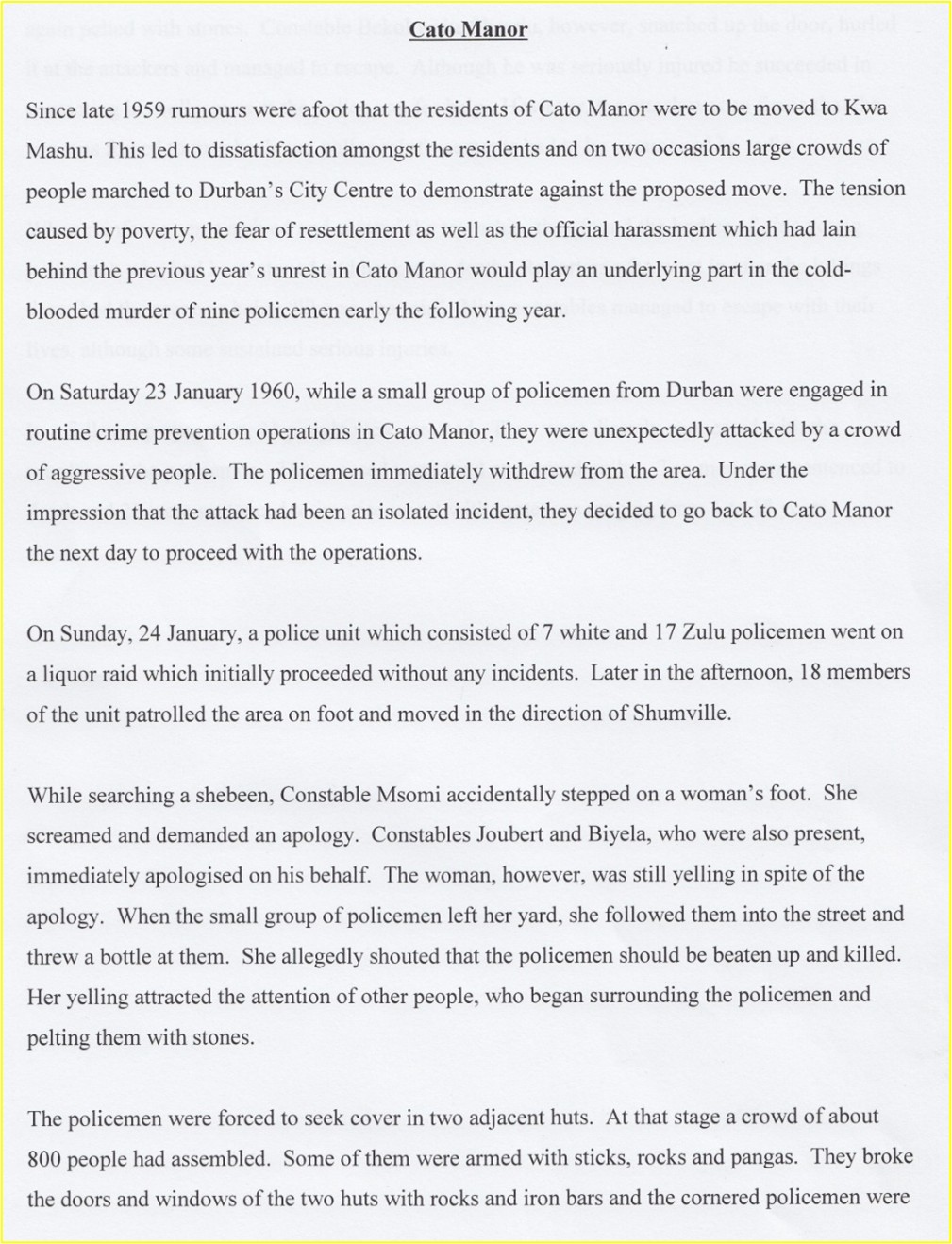 THE 24 JANUARY 1960 MASSACARE OF POLICE AT CATO MANOR: AN OFFICER’S VIEW
