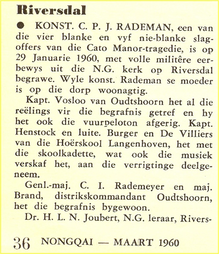 The following members of the Force were murdered at Cato Manor on Sunday 24 January 1960: