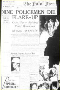 As a young policeman I listened to the stories told by my elder peers about Cato Manor. Later in life when I got much more interested in “police history” I spoke to a detective, Lt-Col Daan Wessels, and asked him before his death how the murders of the policemen were investigated? He told me each murder was investigated separately. He was the investigating officer of one of the murders. He also told me that “Kwa-Ticky” was a place where you paid 3d (21/2 cents) per night for a bed. Nearby a group of traditional beerdrinkers were sitting under a tree enjoying their “sun downer” when a policeman rushed by. They apprehended him and killed the poor unfortunate policeman. While the whole case was investigated the same group congregated under the same tree, before they could be apprehended, lighting struck and killed them all. The locals said it was the spirits who called for the innocent policeman’s blood!