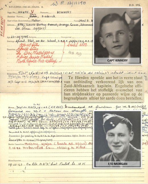 The Department of Defence of the Union of South Africa reported Kinnery MIA on Thursday 11th January 1945 and notified his mother, a widow by that time. On Monday 22nd October he was officially reported KIA. P/O John Morgan was reported Missing in Action, has no known grave and is remembered on Panel 208 on the Runnymede Memorial Surrey. He was 21 years old.