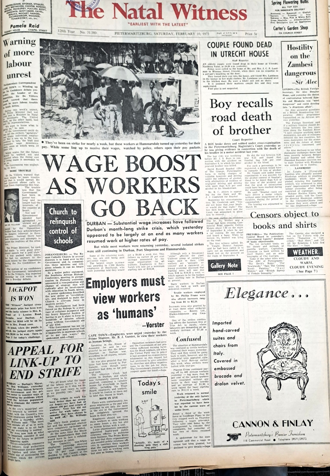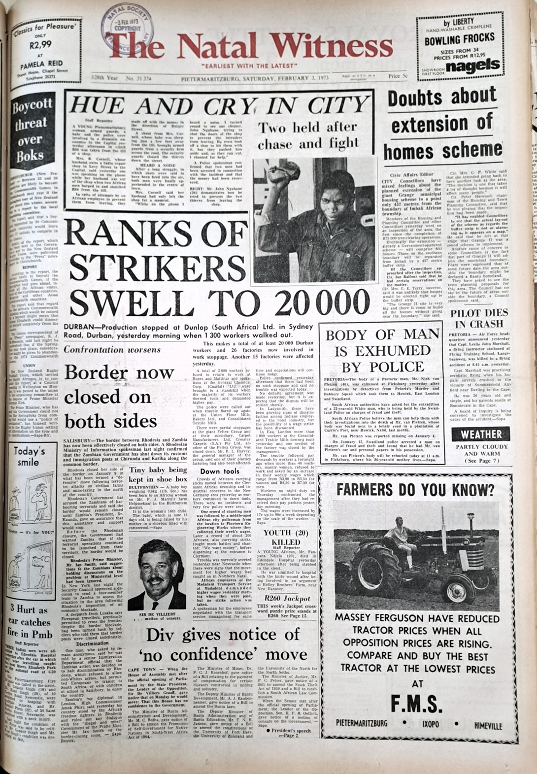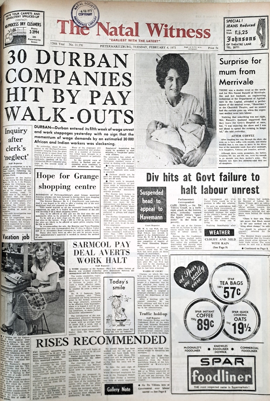 By the end of January 1973, the Durban strikes had come to feature as the main daily news story continuously dominating the front pages of practically all South African newspapers.