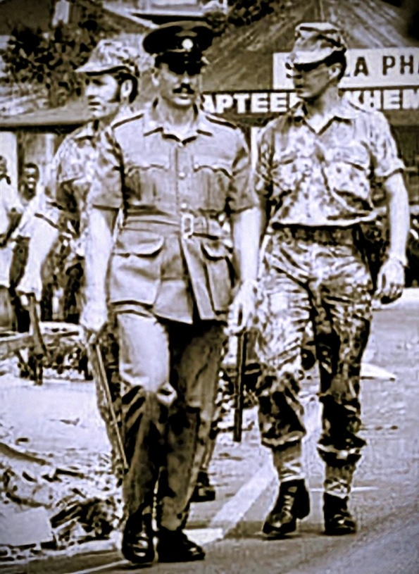 Patrolling policemen carrying only light batons and (the two in the new bush camouflage) their side-arms, whilst the policeman at centre carried no firearm at all.