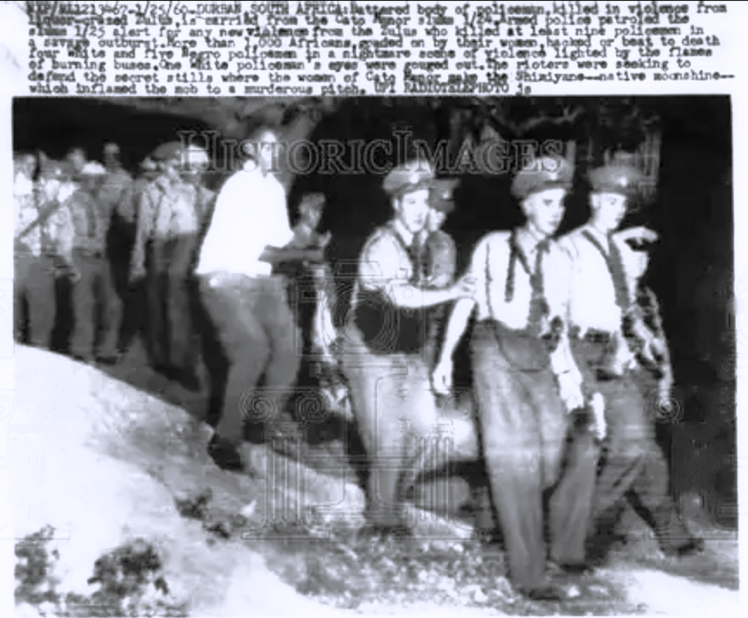 The Police’s awareness of what mob psychosis could lead to was reenforced by the 1960 riots in Cato Manor (then a shanty suburb of Durban) during which nine policemen on an illicit liquor patrol were murdered by an incensed mob, when a Shebeen Queen (i.e., owner of an unlicensed township speak-easy selling home brews) riled them up by falsely accusing the policemen of having assaulted her and disrespected her dignity.